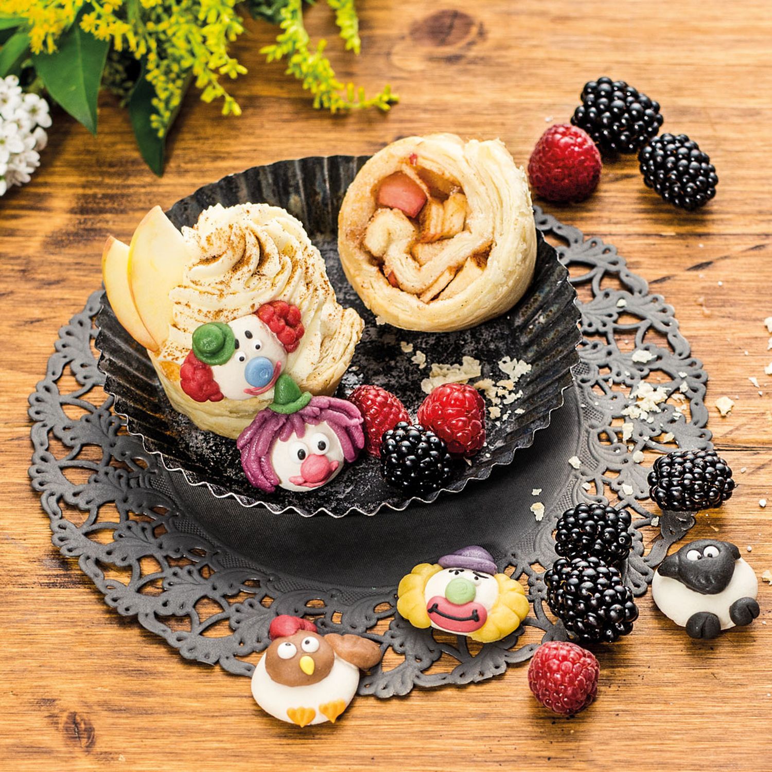 Blätterteig ausrollen, die Apfelscheiben darauf verteilen und mit Zimt und Zucker bestreuen. Blätterteig vorsichtig zusammenrollen und in 4 cm lange Stücke schneiden.