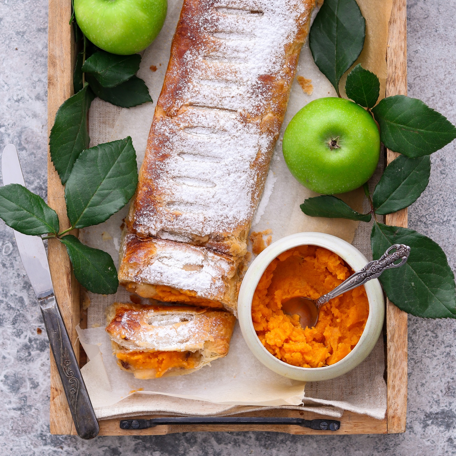 Die Äpfel schälen und reiben. In einer Schüssel mit Kürbis, Walnüssen, Zucker, Vanillezucker, Zimt und Ingwer vermischen.