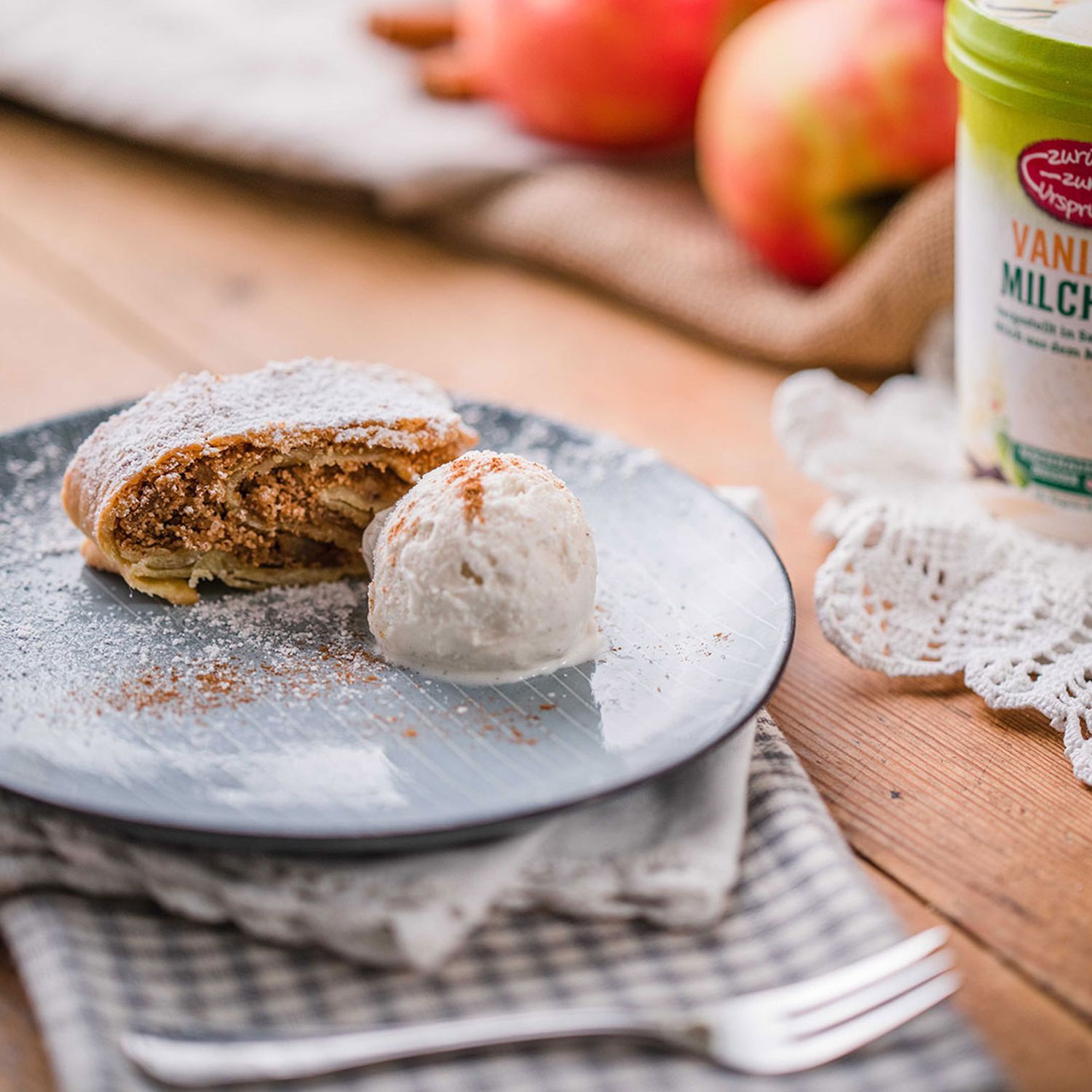 Mit Staubzucker garnieren und mit Bio-Vanilleeis servieren.