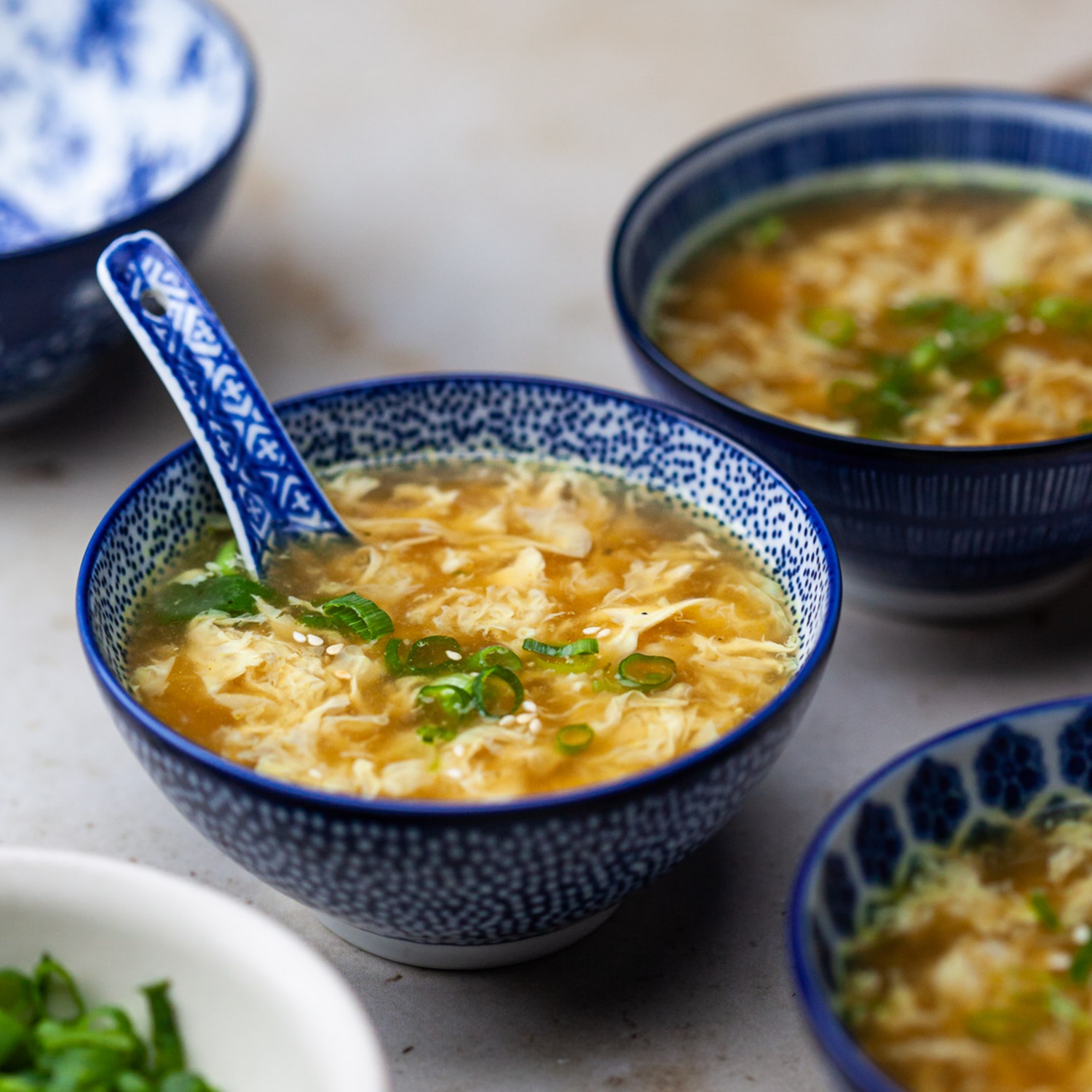 4. Die Suppe vorsichtig in eine Richtung rühren, um einen Wirbel in der Mitte zu erzeugen. Die verquirlten Eier langsam in die Suppe gießen und auf der Oberfläche stocken lassen. Bei Bedarf vorsichtig mit einer Gabel umrühren.