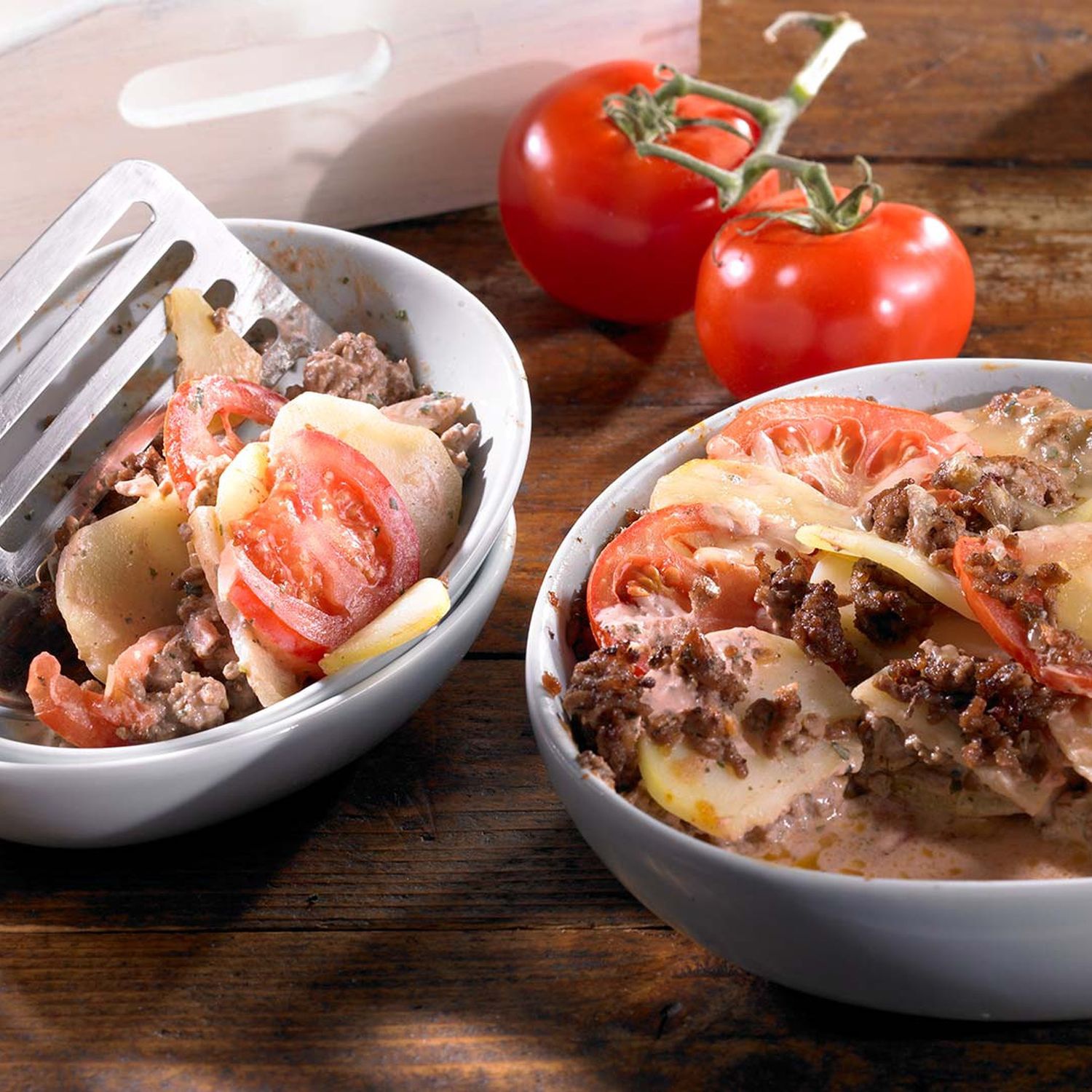 Eine feuerfeste Auflaufform mit dem übrigen Olivenöl einstreichen, die Kartoffel- und Tomatenscheiben abwechselnd mit dem Faschierten in die Form schichten.