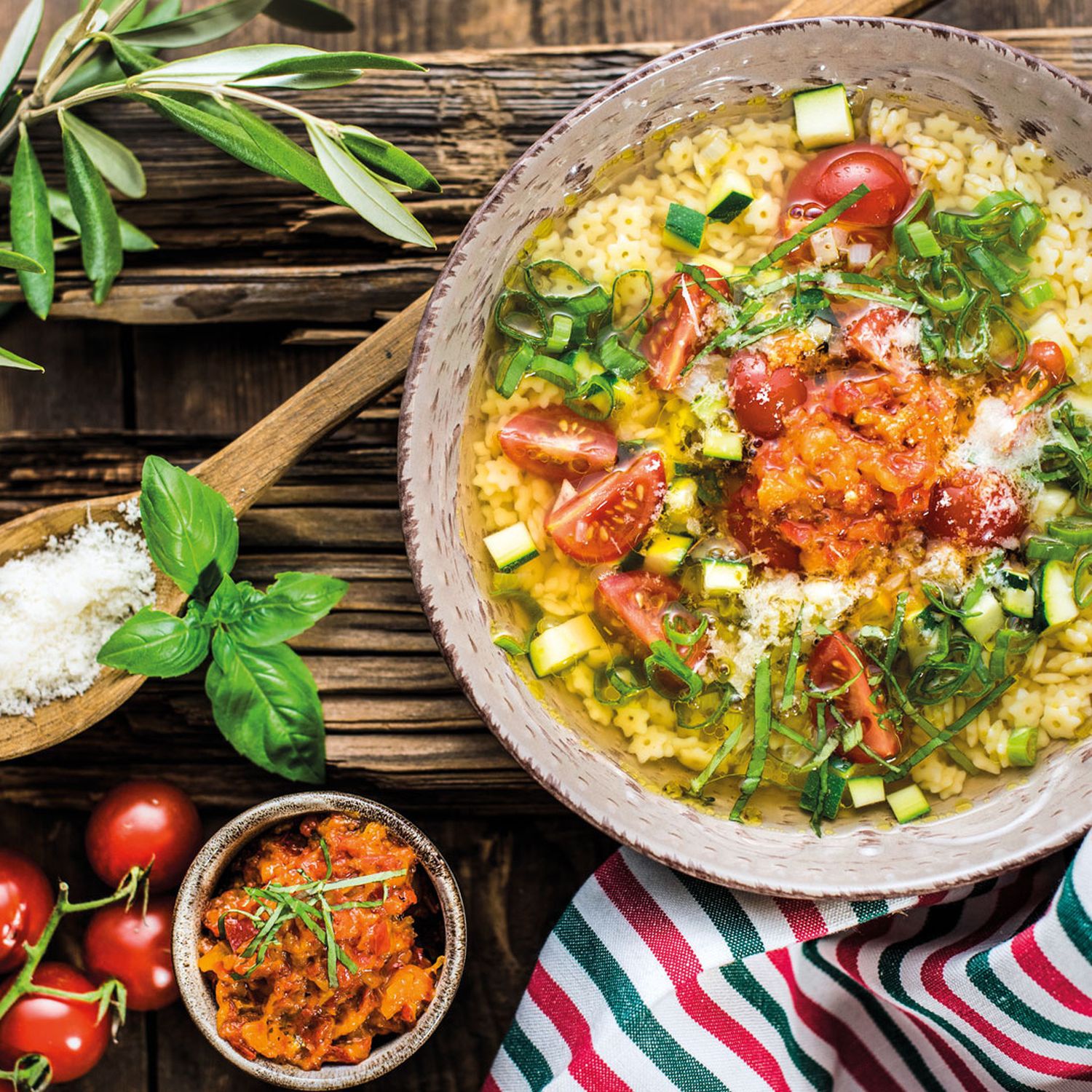 Olivenöl erhitzen, Zwiebeln und Knoblauch darin anschwitzen. Anschließend mit dem Gemüsefond aufgießen. Zucchini, Kirschtomaten, Nudeln und Oregano beimengen und noch einmal aufkochen lassen.