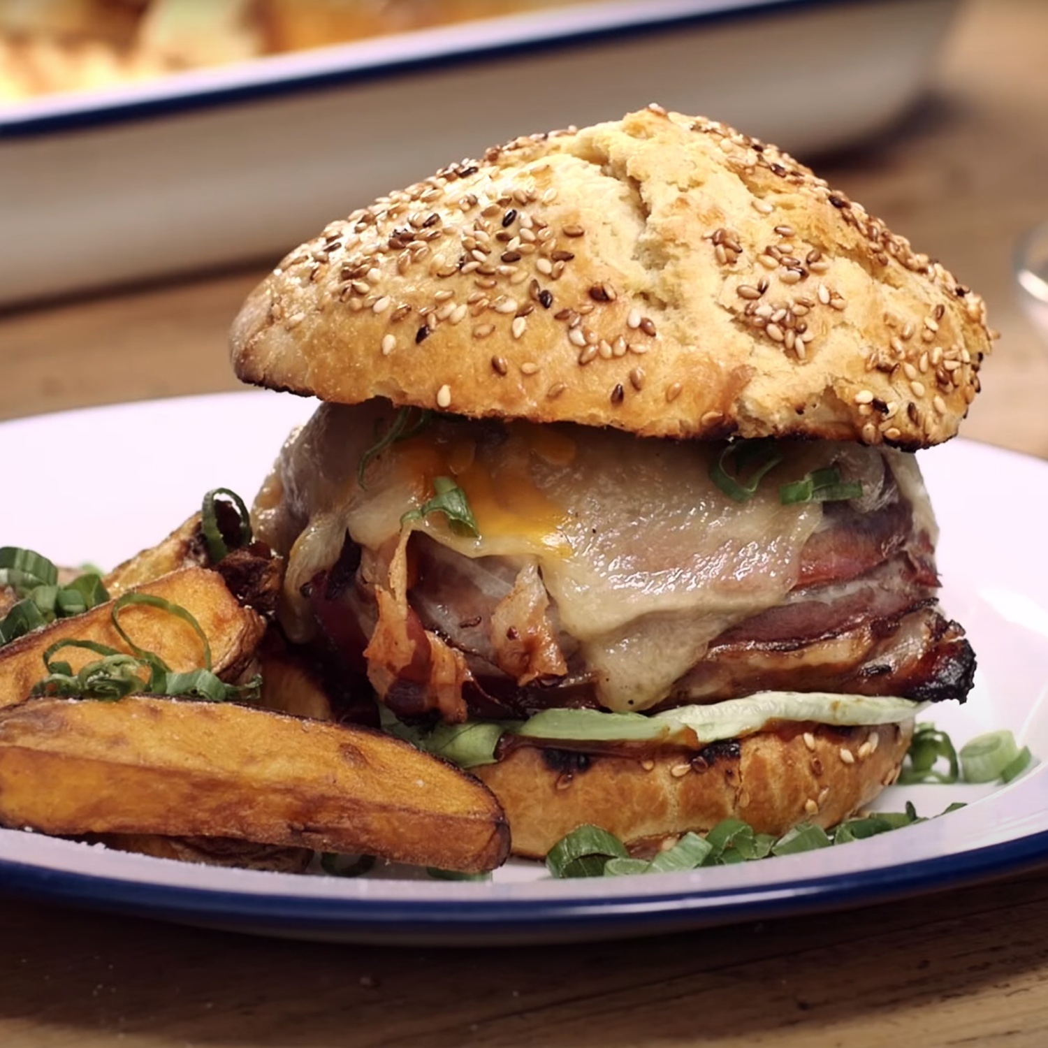 Barbecue-Sauce auf den Weckerln verstreichen und das Burgerlaibchen zwischen den Brothälften platzieren. Den fertigen Burger mit Potatoe Wedges garnieren – Mahlzeit!