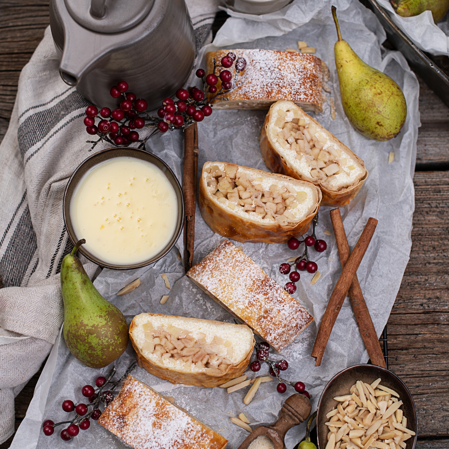 Die Birnenwürfel gleichmäßig darauf verteilen und zu einem Strudel einrollen.