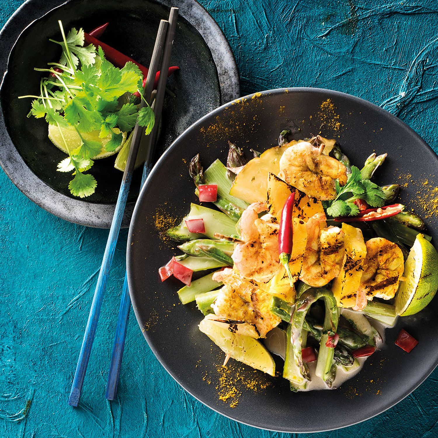 Die Spieße auf direkter Hitze für ca. 3–4 Minuten auf beiden Seiten grillen. Spieße auf dem Spargel-Kokossalat platzieren.