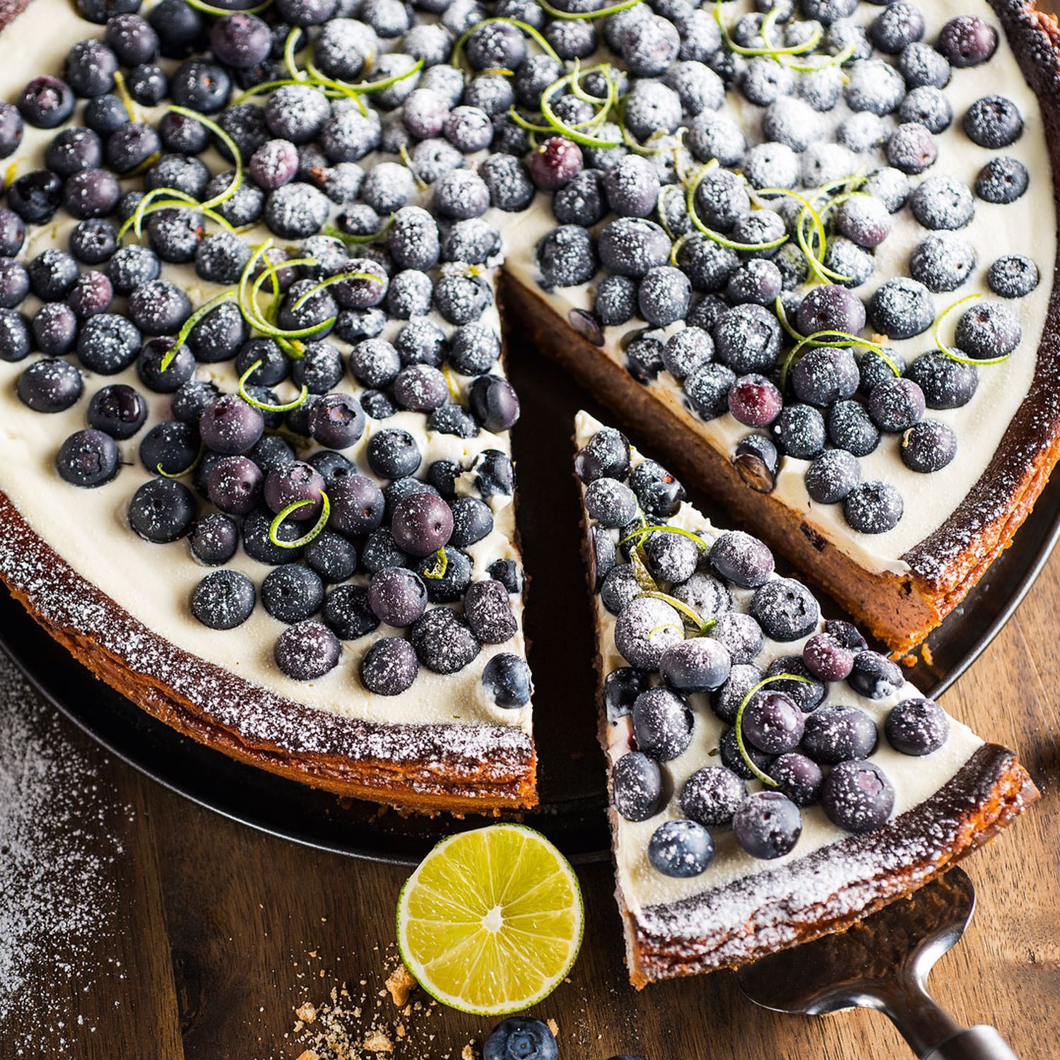 Das Backrohr auf 160 °C vorheizen. Die Schale von der Limette abreiben. Danach den Frischkäse mit dem Zucker und der Limettenschale glattrühren. Die Eier einzeln kurz einrühren und anschließend das Heidelbeerpüree unter die Masse rühren. Schlagobers mit Puddingpulver steif schlagen und mit dem Schneebesen unter die Frischkäsemasse heben. Die Füllung in der Form verteilen und glattstreichen.