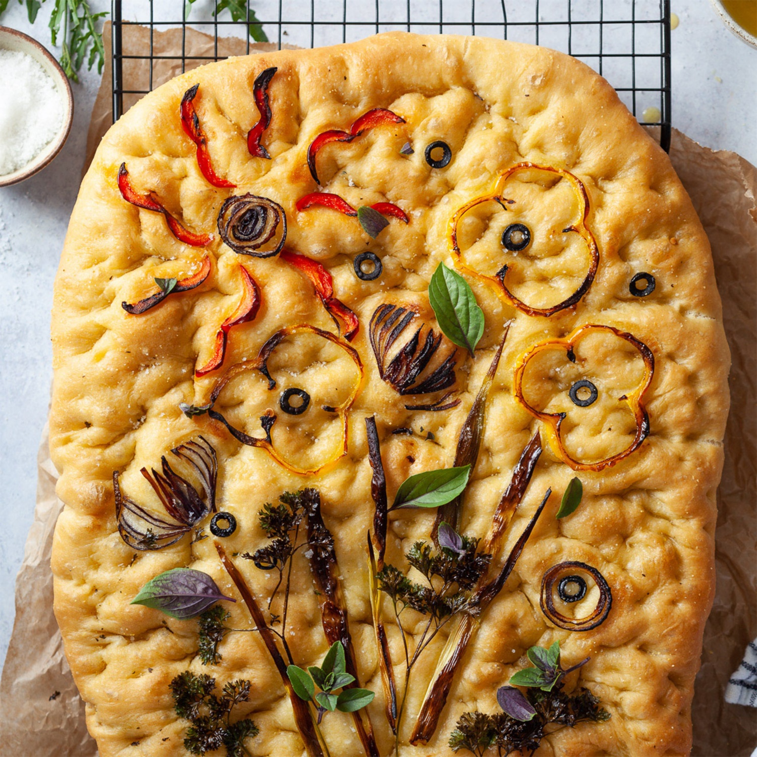 Focaccia ist ein italienischer Klassiker. Unser tolles Rezept ist nicht nur super köstlich, sondern überzeugt auch optisch durch die Garnierung aus frischem Gemüse in Form einer Blumenwiese. Wir wünschen viel Spaß!