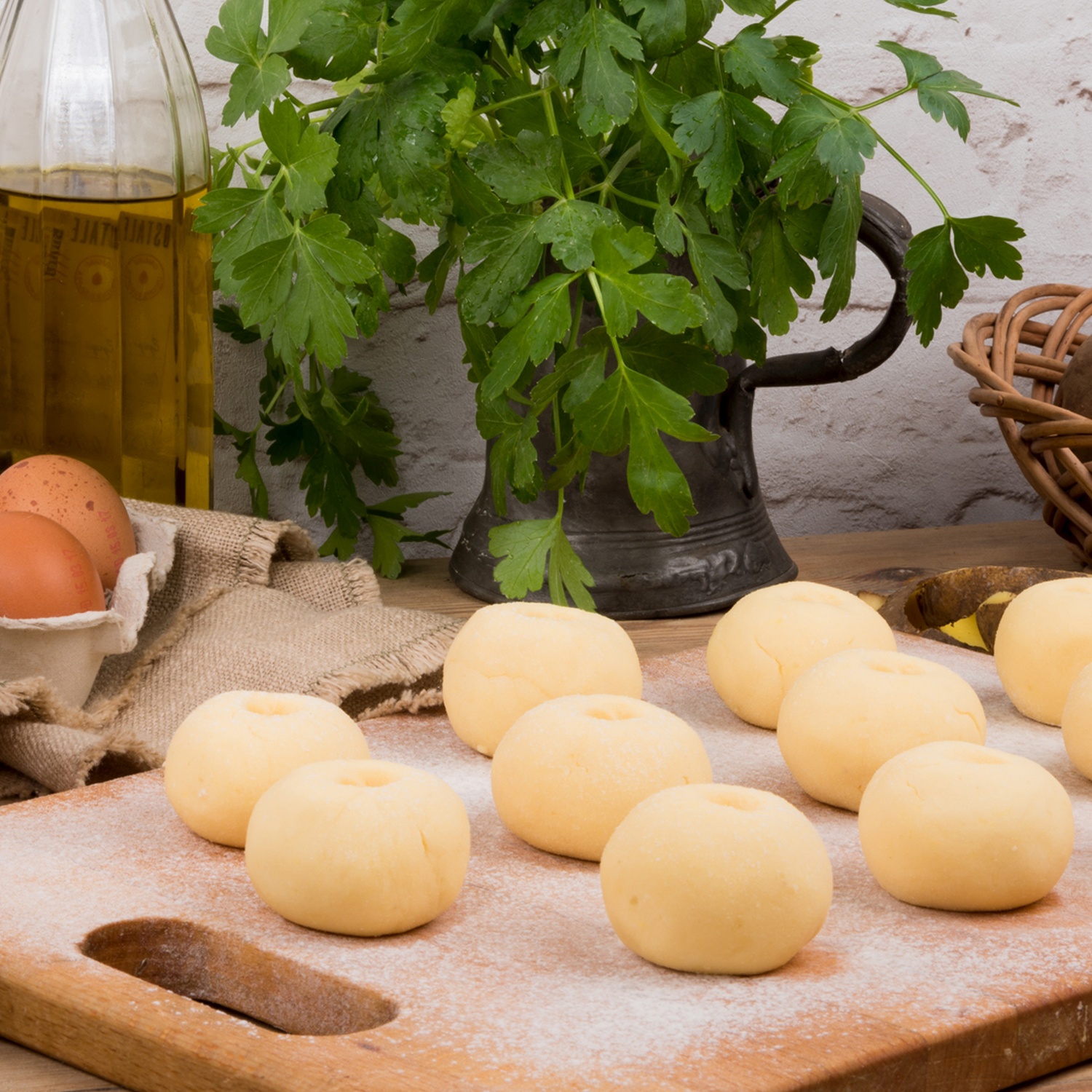 Die zerdrückten Kartoffeln mit dem Topfen vermischen und mit Salz leicht würzen. Danach die Kartoffelmasse mit leicht erwärmter Butter, Mehl, Grieß und Ei zu einem Teig kneten und im Kühlschrank für 30 Minuten rasten lassen