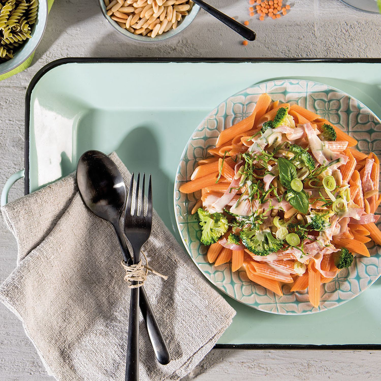 Die Nudeln nach Packungsanleitung bissfest in heißem Wasser kochen und abgießen. Die Frühlingszwiebeln in Ringe und den Schinken in Streifen schneiden. Die Basilikumblätter fein hacken.