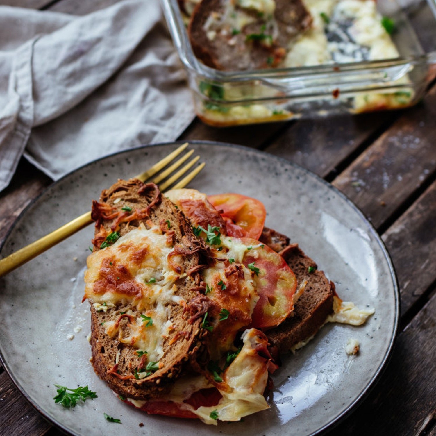 Die Brotscheiben abwechselnd mit dem Schinken, Tomaten- und Käsescheiben in eine Auflaufform schlichten.