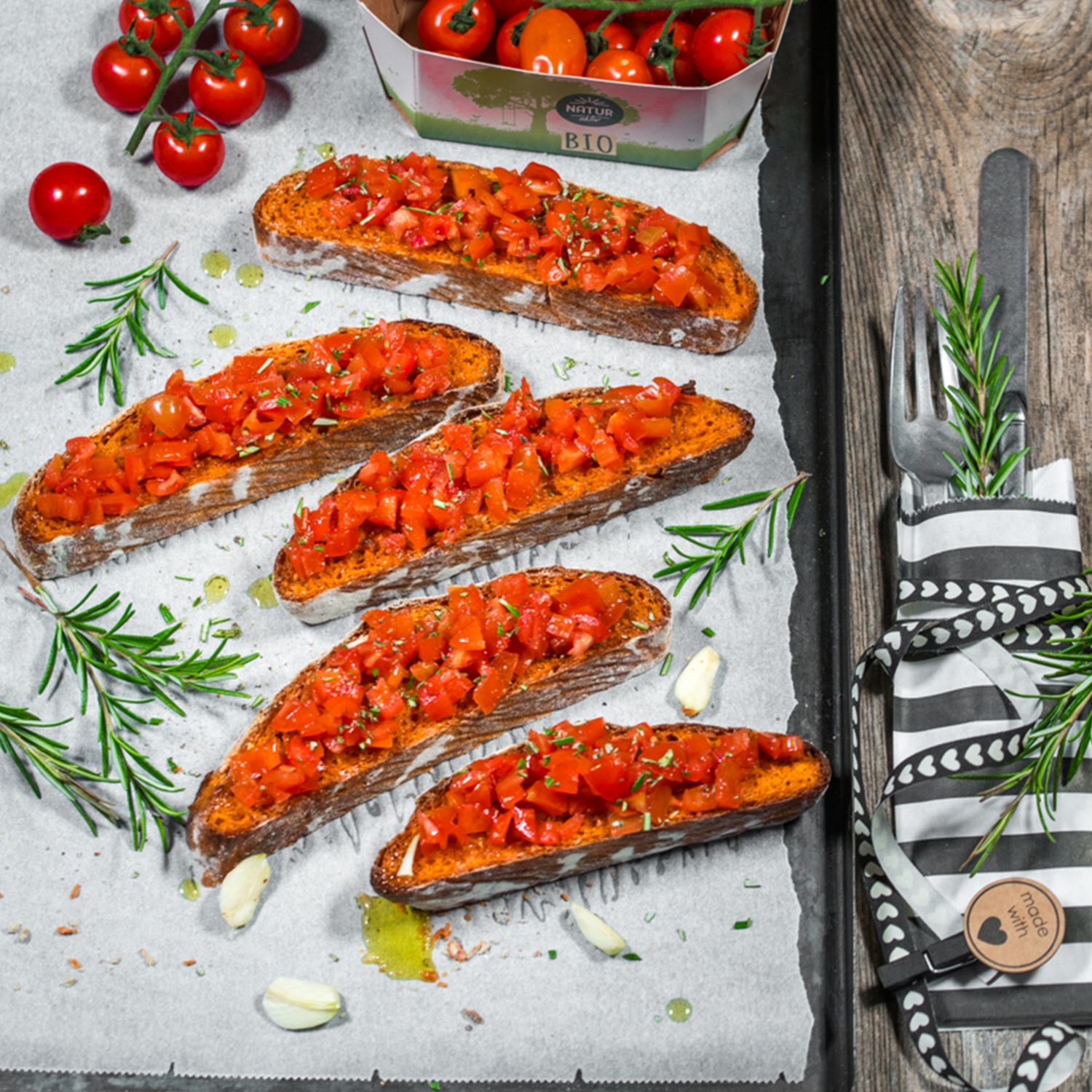 Ciabatta in 2 cm dicke Scheiben schneiden und im Backrohr mittels Grillfunktion bei 160°C Heißluft ca. 5 Minuten anrösten.