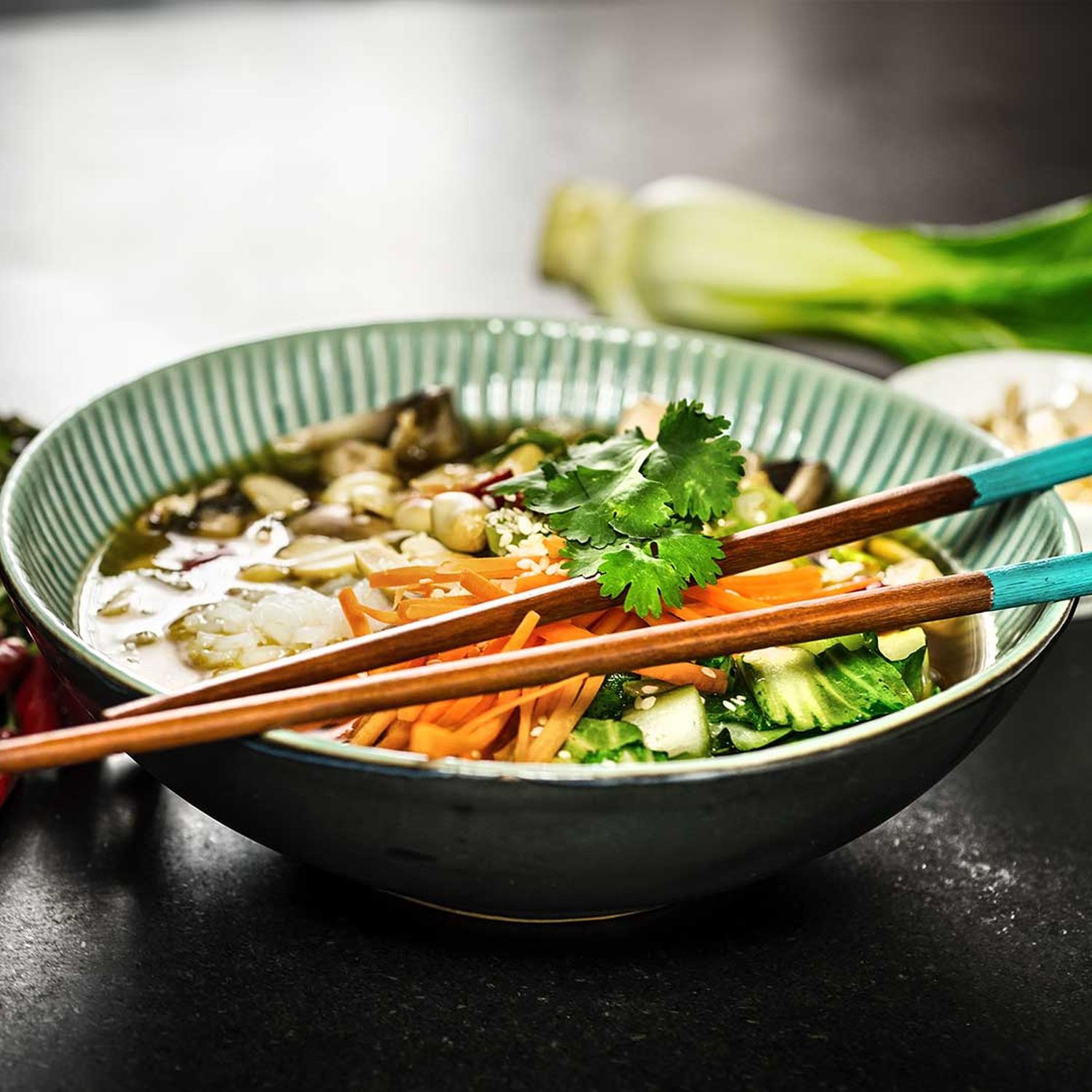 Auf Schüsseln verteilen. Den heißen Reis in die Schüssel füllen. Auch die Karotten und den Jungzwiebel in die Schüsseln füllen und mit heißem Gemüsefond übergießen. Mit Chili, Erdnüssen, Sesam und Koriander bestreuen.