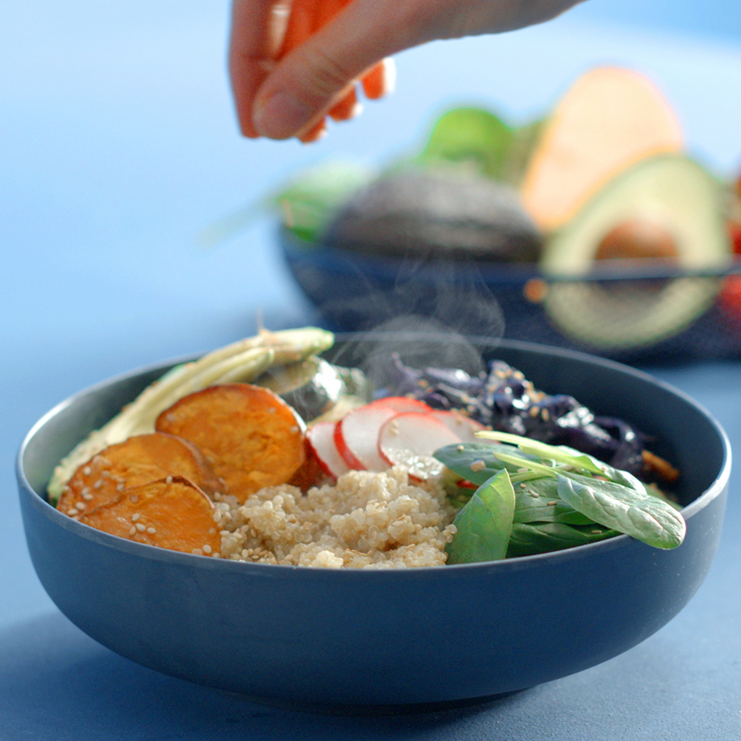 Den gekochten Quinoa in die Bowl geben, mit Blattspinat belegen und mit der aufgeschnittenen Avocado und dem Ofengemüse garnieren.
