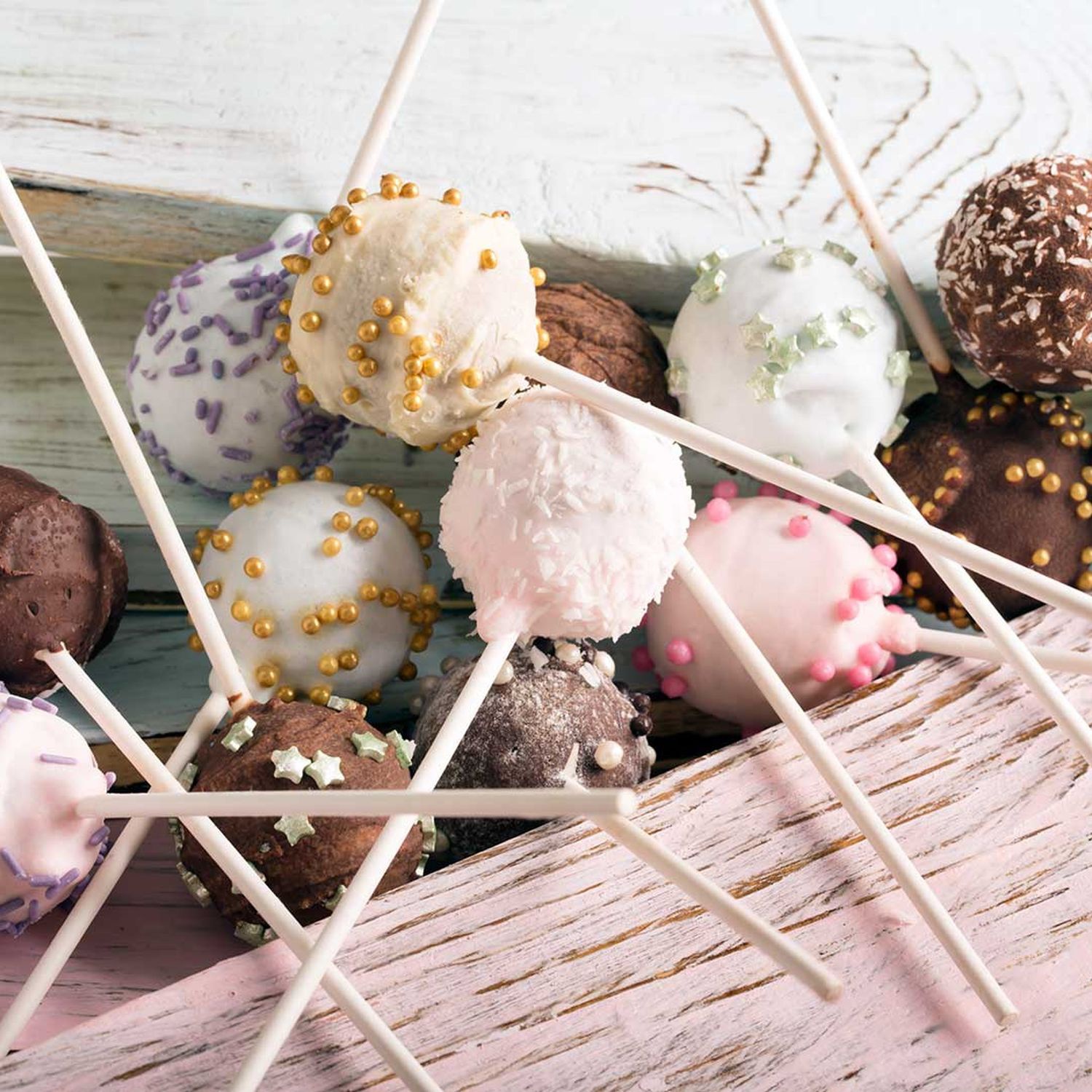 Kakao-Glasur mit Kuvertüre verrühren. Die Cake-Pops darin tunken und etwas drehen, damit die Glasur verlaufen kann. Die Cake-Pops vor dem Festwerden der Glasur mit beliebigen Dekor bestreuen und in ein mit Alufolie umwickeltes Styropor stecken.