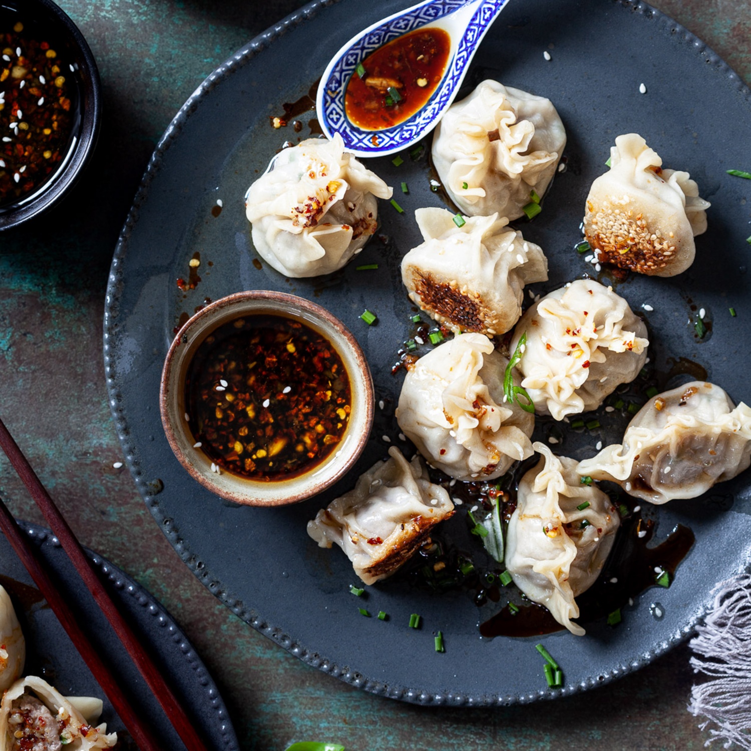 Die Teigtaschen sind nun fertig und werden gemeinsam mit der Sauce serviert. Optional können gerne noch ein paar Sesamkerne oder geschnittene Frühlingszwiebeln über die Teigtaschen gestreut werden.