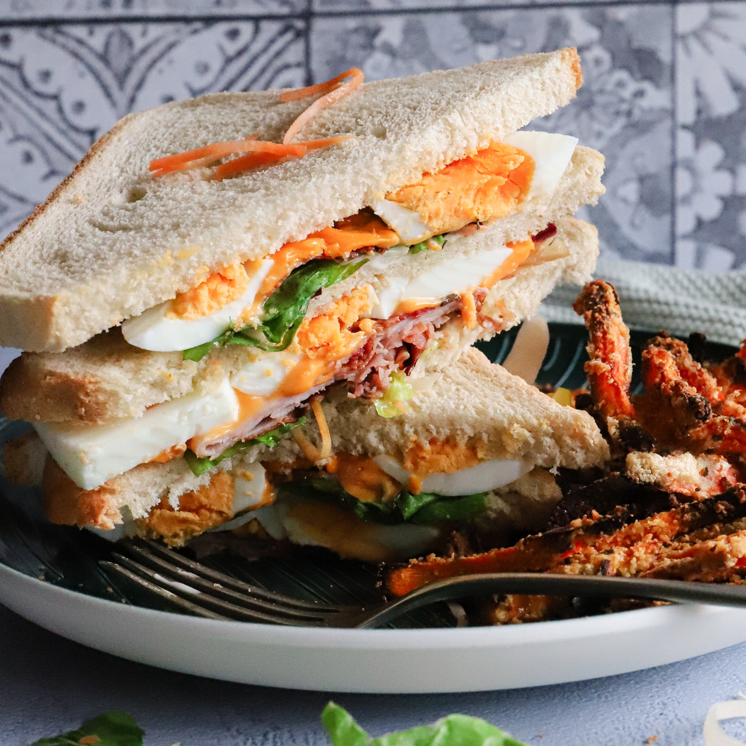 Schnell und günstig: Unser Club Sandwich mit Süßkartoffel-Pommes ist ein einfach zubereitetes Mittag- oder Abendessen für die ganze Familie!