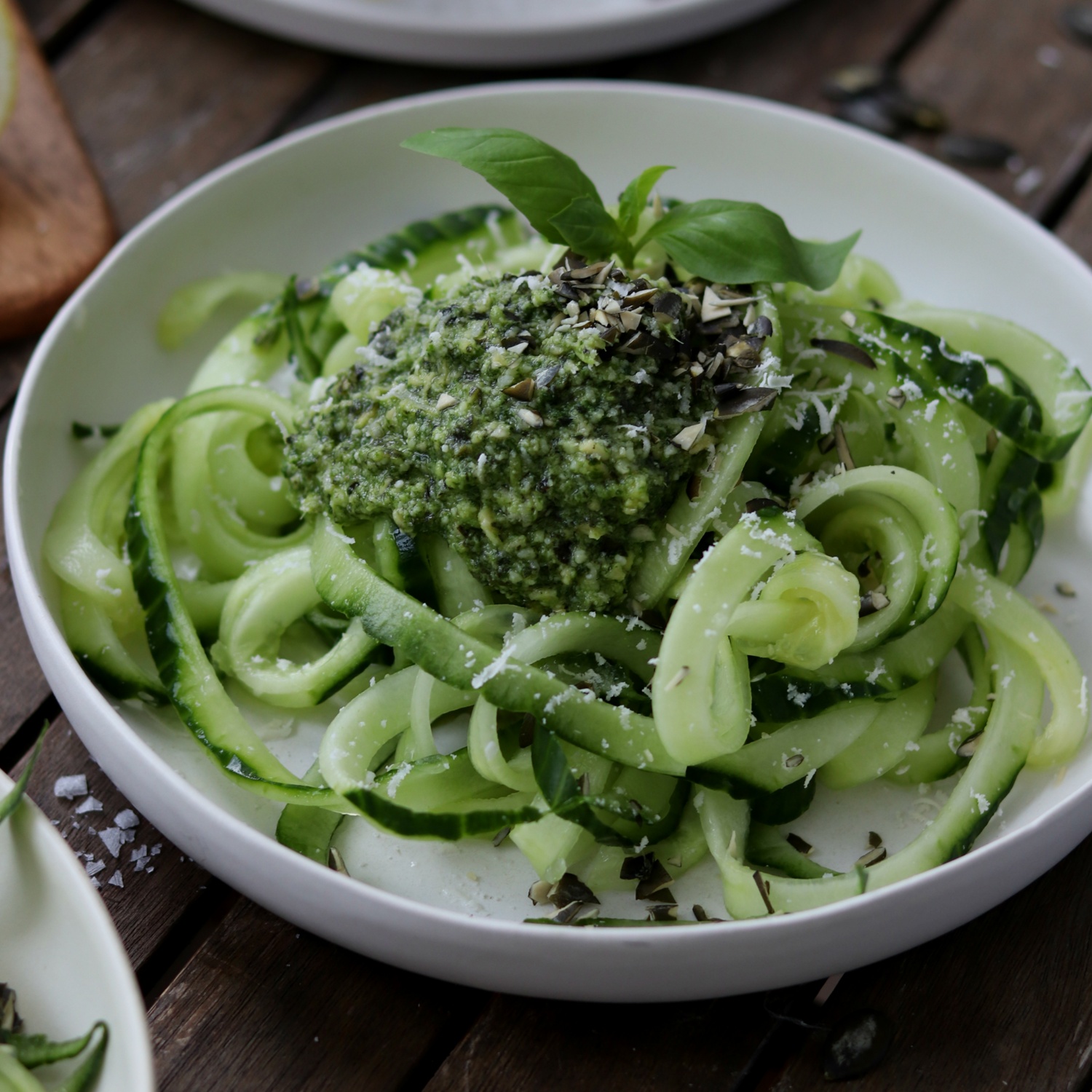 Bei Coodles handelt es sich um ein zusammengesetztes Wort aus Cucumber und Noodles. Als Abwechslung zu den Zoodles (Zucchini-Nudeln) kommen in diesem Rezept Gurken statt Nudeln zum Einsatz! Ergänzt wird das ganze mit einem erfrischenden Basilikum-Kürbiskern-Pesto! Das perfekte Sommergericht! Gleich ausprobieren!