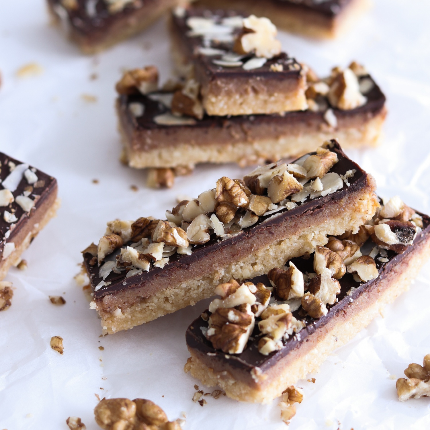 Riegel einschneiden, mit gehackten Walnüssen bestreuen und zum Aushärten für 2 Stunden in den Kühlschrank stellen.
