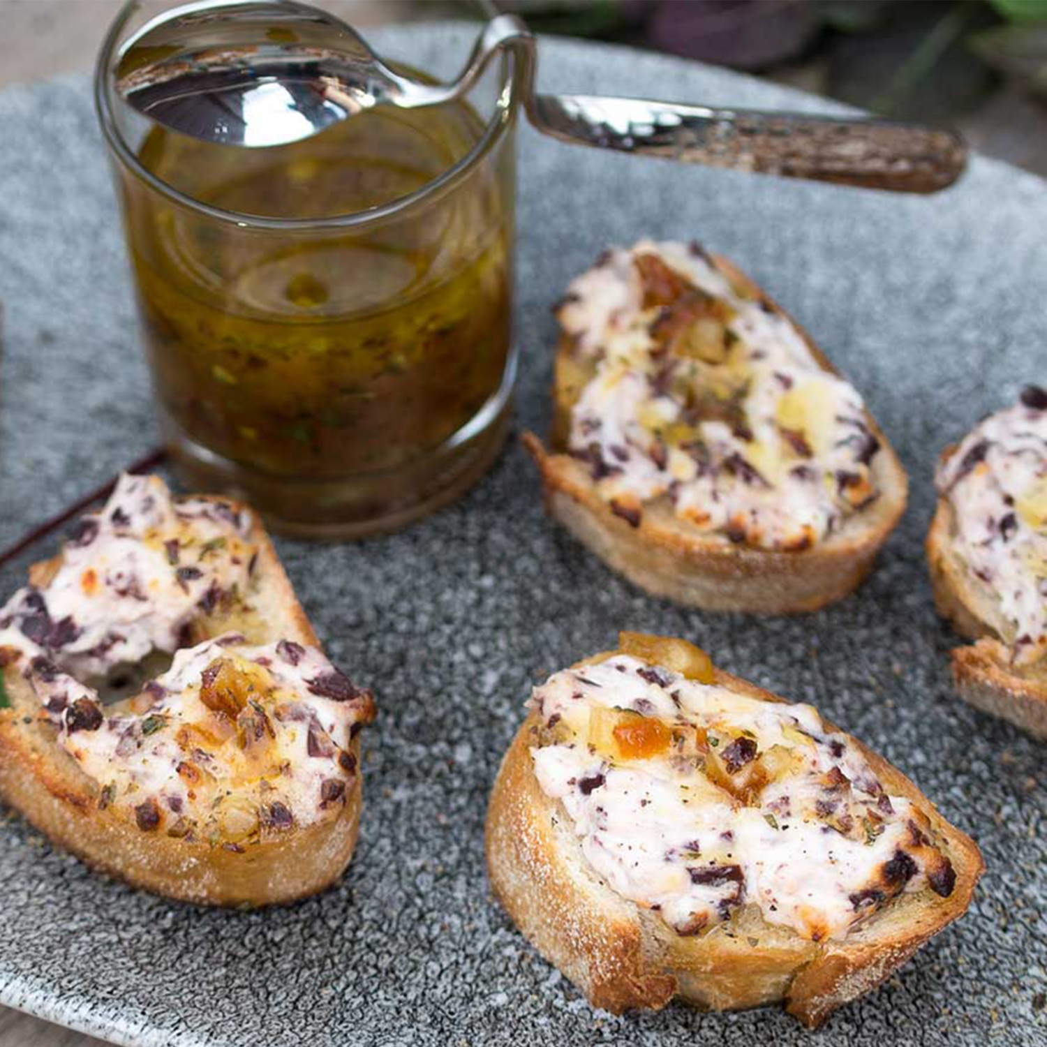 Baguette in Scheiben schneiden und mit jeweils ein paar Tropfen Olivenöl beträufeln. Nun die Brötchen mit der Käsecreme bestreichen und die Brötchen auf einem Backblech für ca. 5 bis 6 Minuten knusprig backen, bis eine leichte Bräunung zu sehen ist.
