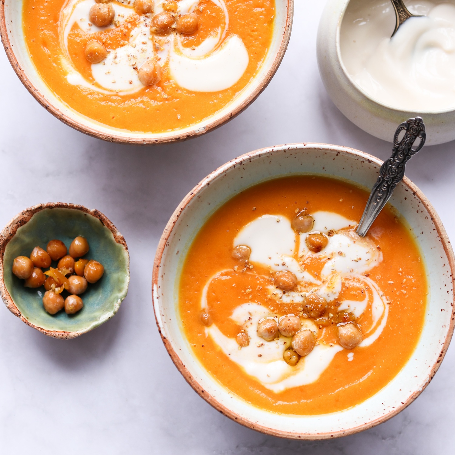 Probieren Sie diese cremige Karottensuppe mit veganen Zutaten. Für mehr Eiweiß fügt man Kichererbsen hinzu, es funktioniert aber auch mit anderen Hülsenfrüchten nach Wahl.