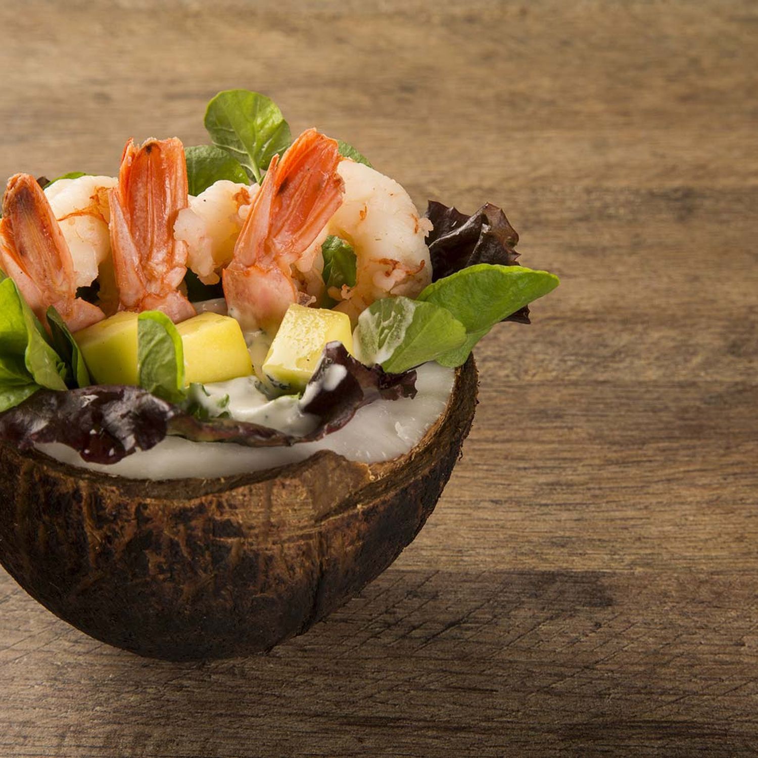 Mango- und Avocadowürfel, Trauben sowie Crevetten locker in die Gläser füllen und mit dem Sauerrahm-Dressing übergießen.