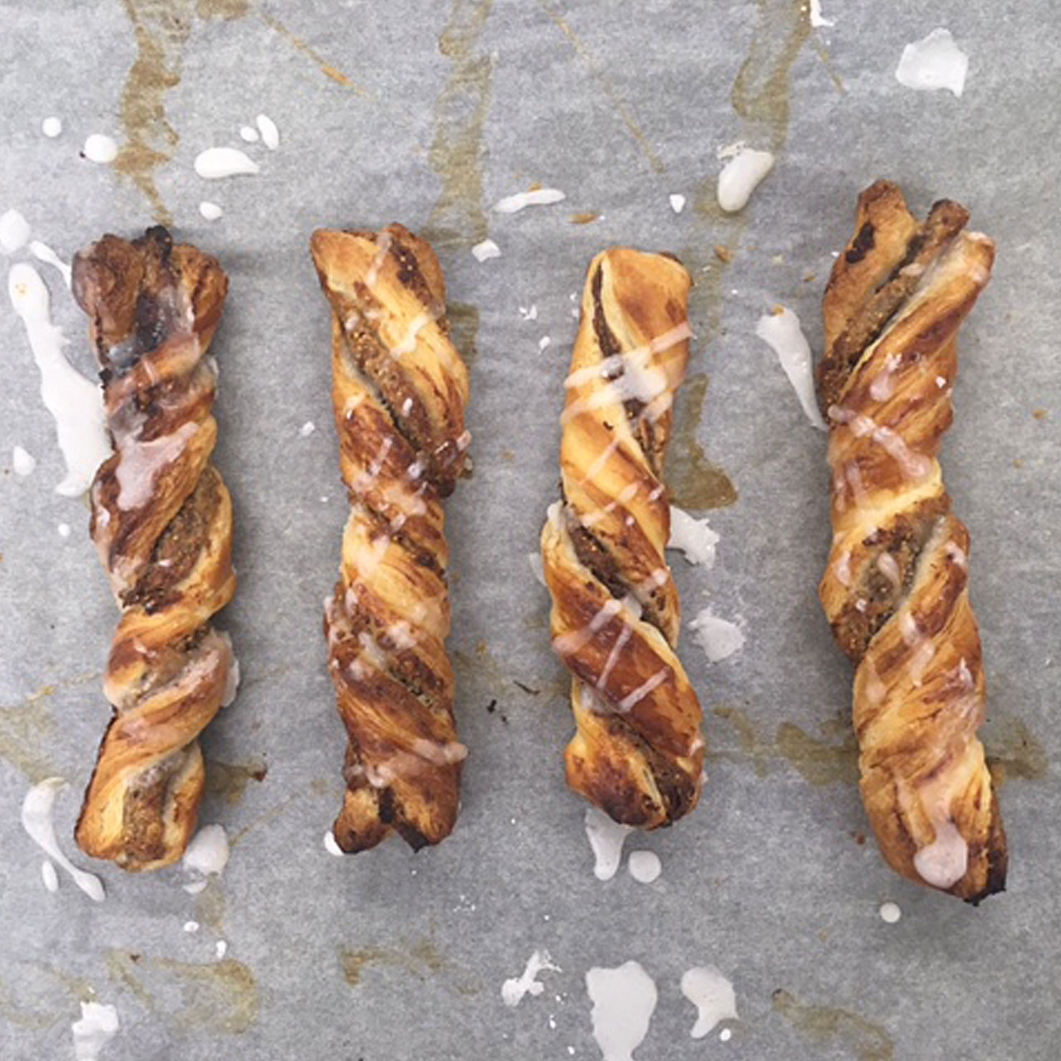 Den Plunderteig ausrollen und halbieren. Auf einen Teil des Teiges die Fülle auftragen, mit dem anderem Teil bedecken und den Teig leicht andrücken.