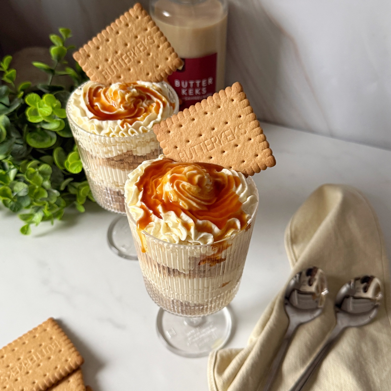 Die Gläser abwechselnd mit den Zutaten füllen: Beginne mit einer Schicht Butterkeksbrösel, darauf eine Schicht Creme und anschließens Karamellsauce. Die oberste Schicht sollte Karamell sein.