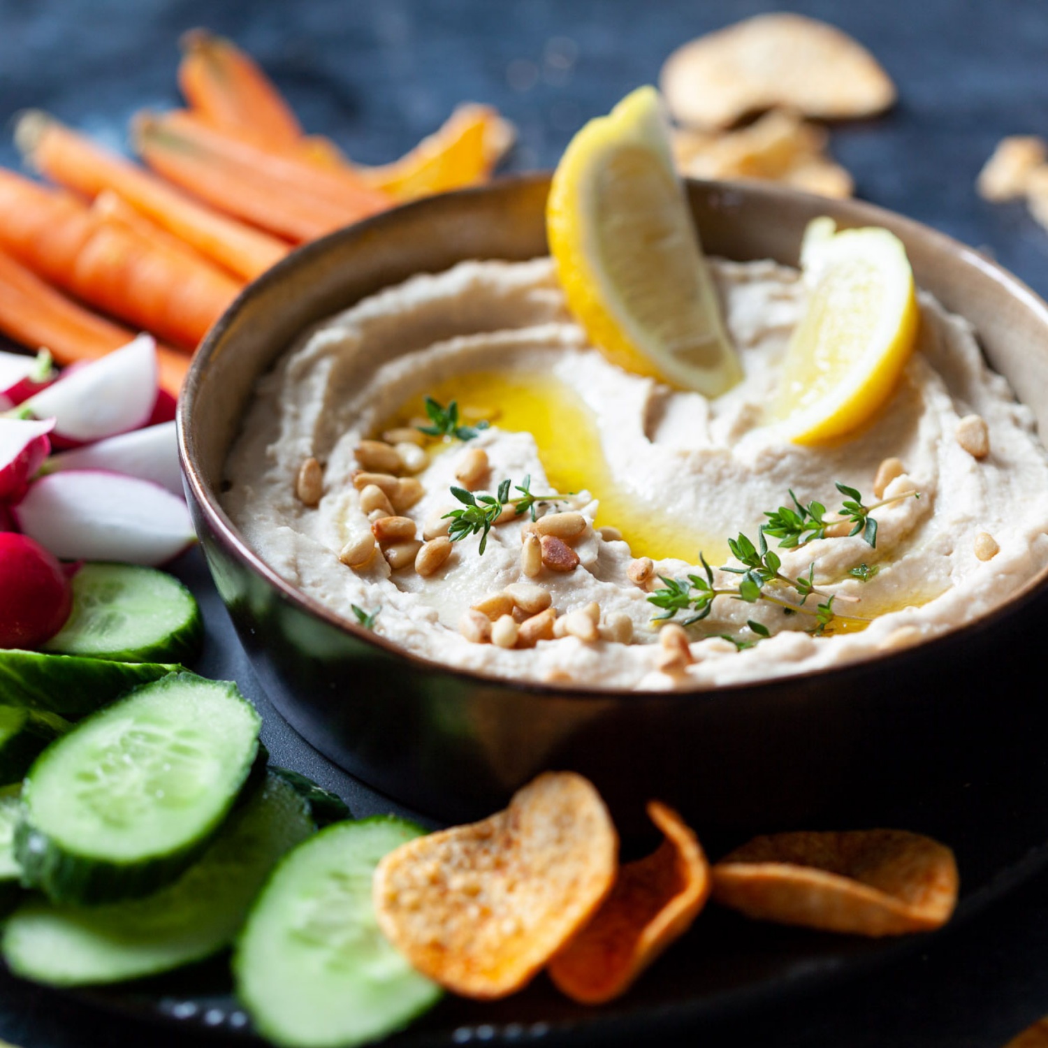 Dip mit Zitronensaft und Olivenöl abschmecken und mit Brot oder Gemüsesticks genießen.