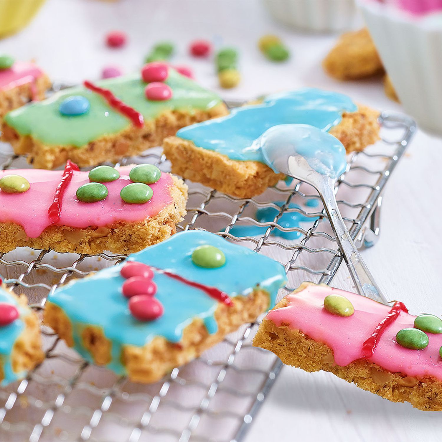 Rechtecke herausschneiden und zum Auskühlen auf ein Kuchengitter legen. Für die Glasur Staubzucker, Zitronensaft und Lebensmittelfarbe gut verrühren. Rechtecke mit Zitronenglasur bepinseln und Dominopunkte aufkleben.