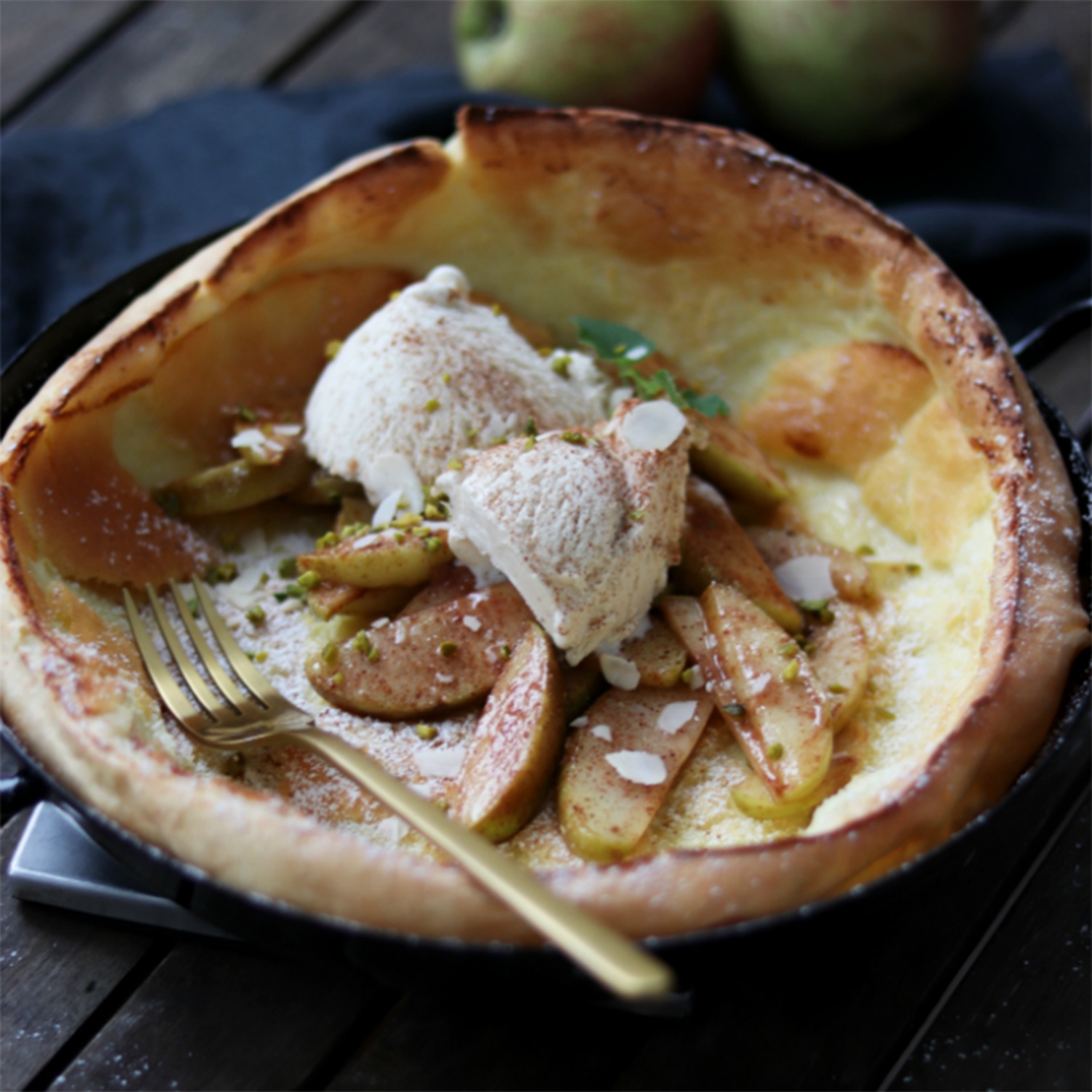 5. Das fertige Dutch Baby aus dem Ofen nehmen, die Apfelspalten darauf geben, alles mit Staubzucker bestreuen und gemeinsam mit Vanilleeis servieren.