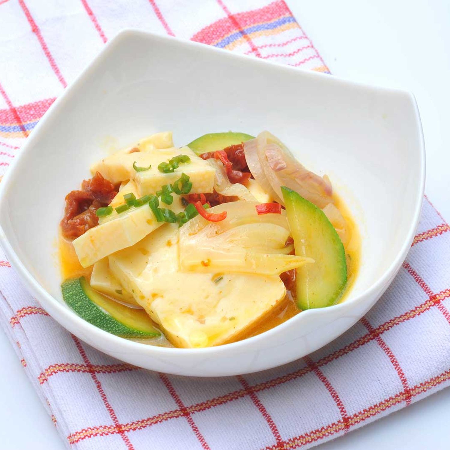 Den Käse in etwa 0,5 cm dicke Scheiben und 4 cm große Stücke schneiden und in eine tiefe Servierform einlegen. Das Gemüse mit der Marinade darüber verteilen und bei Raumtemperatur 1 bis 2 Stunden ziehen lassen.