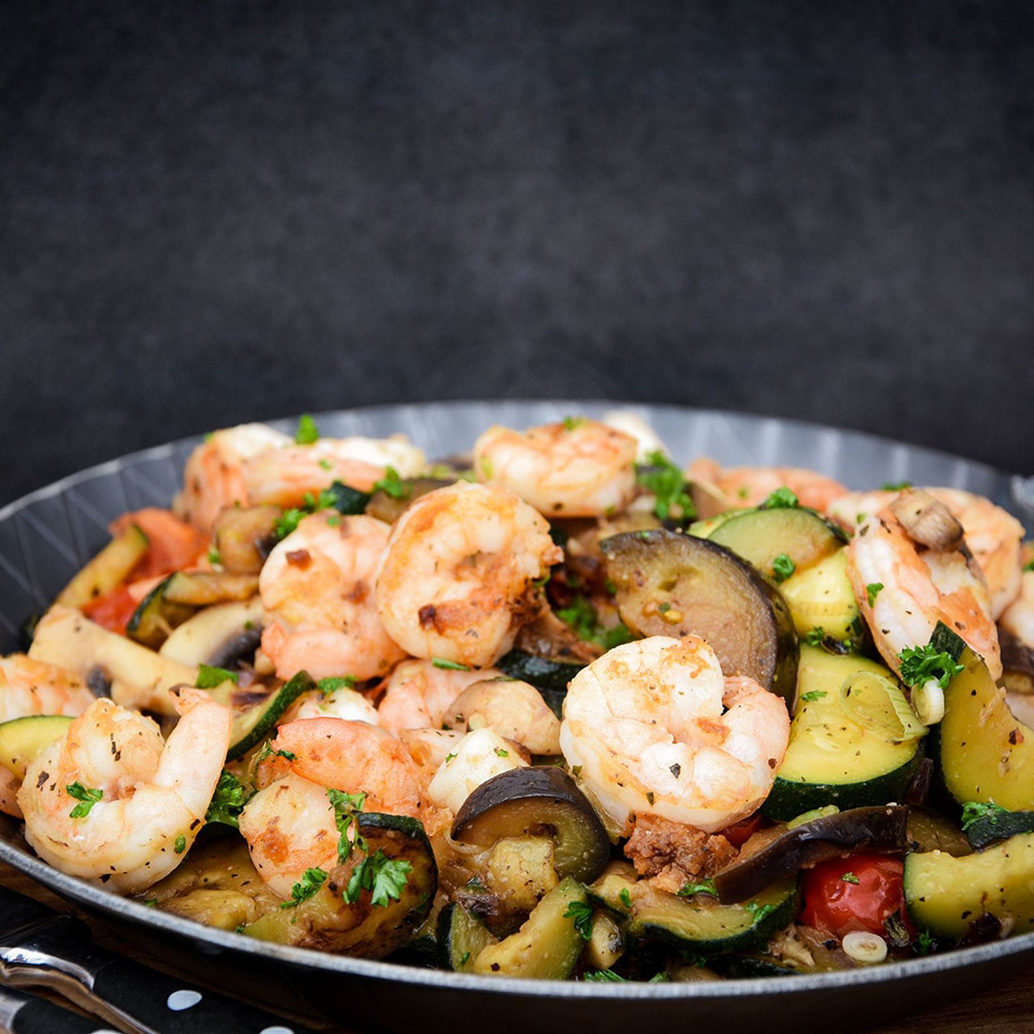 Das Gemüse auf Tellern anrichten und die Garnelen darauf verteilen. Mit beliebigen Kräutern garnieren.