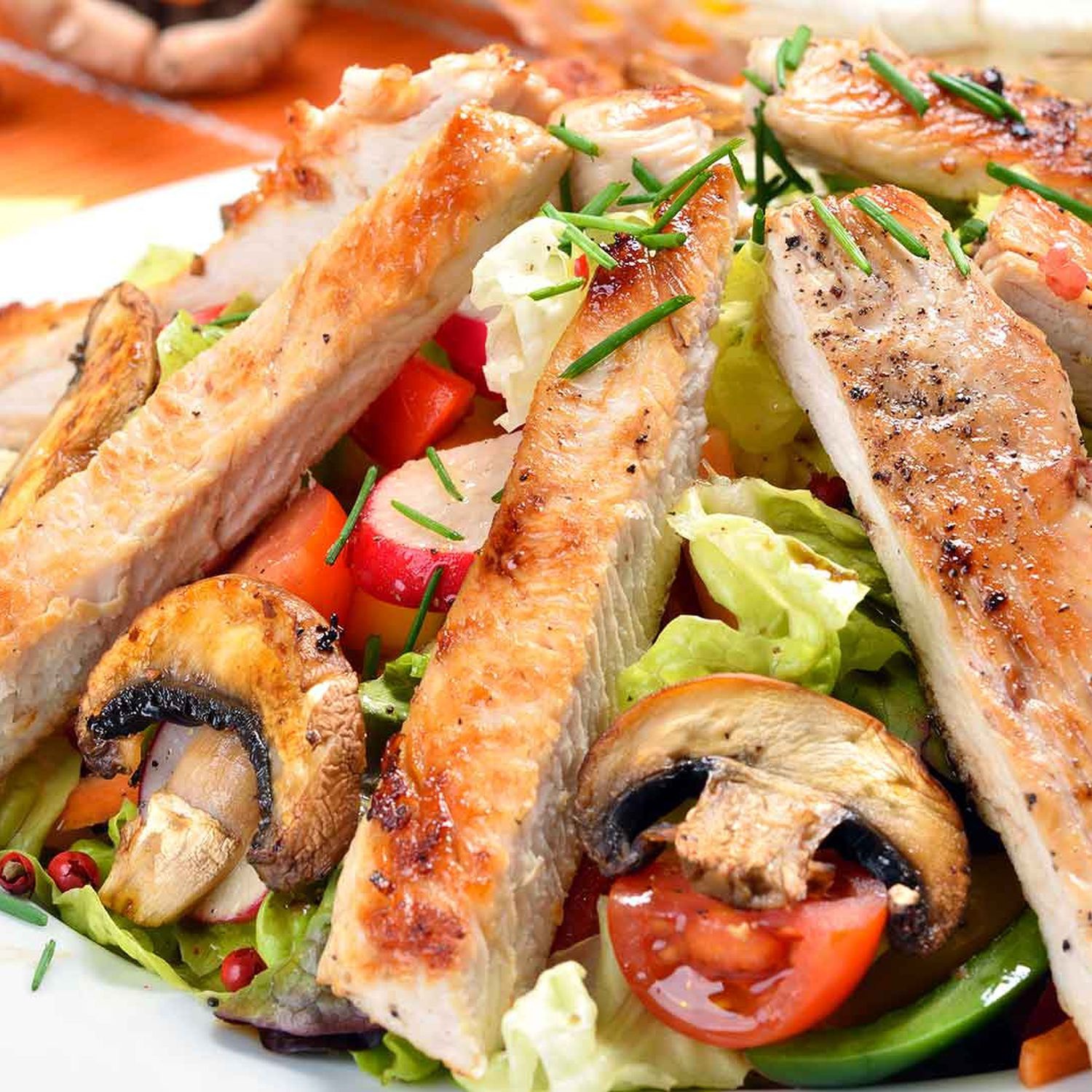 Eisbergsalat mit Champignons und Putenstreifen