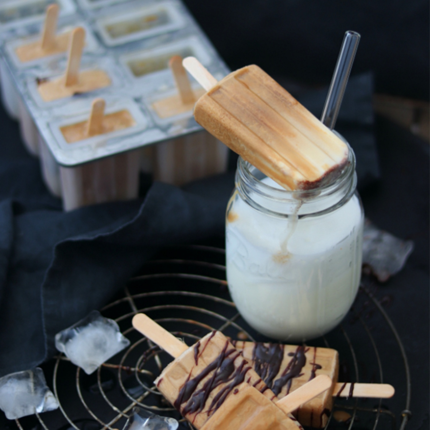 Zu guter Letzt zuerst die Sahne auf die Eisformen aufteilen. Dann den Kaffee über einen Löffel vorsichtig hineinfließen lassen, damit ihr einen schönen Farbverlauf bekommt.