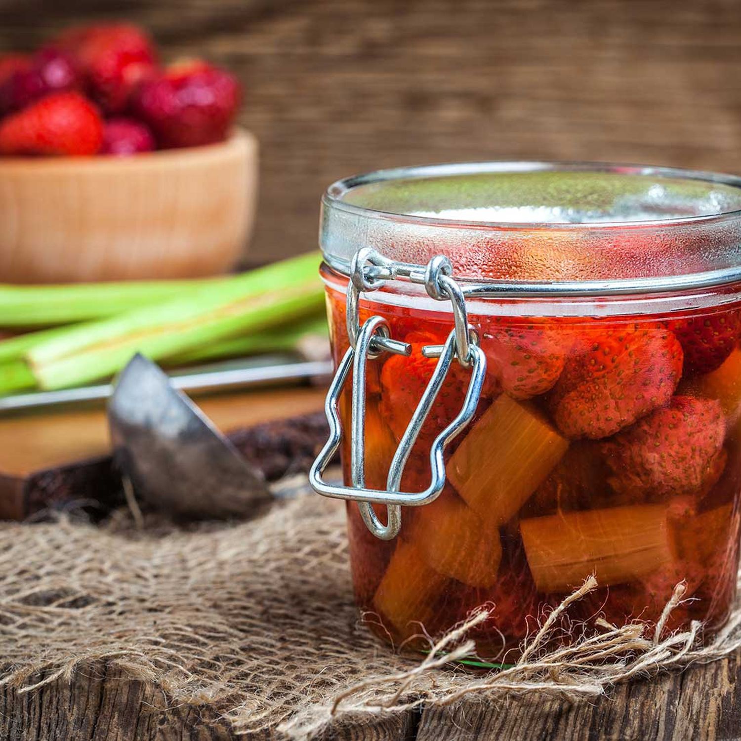 Die Erdbeeren und den Rhabarber gut waschen und jeweils in kleine Stücke schneiden.