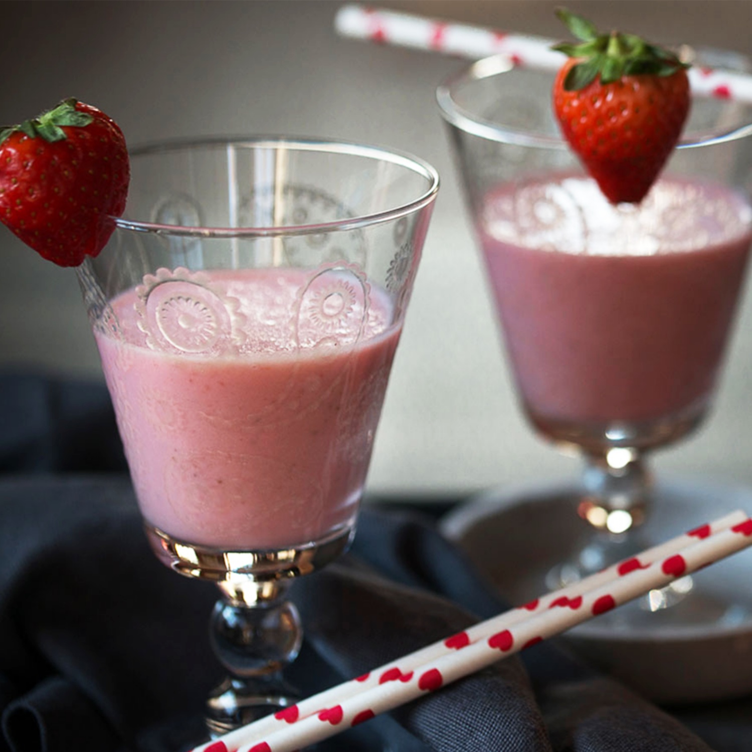 Shake in Gläser anrichten, mit einer Erdbeere drapieren und genießen.