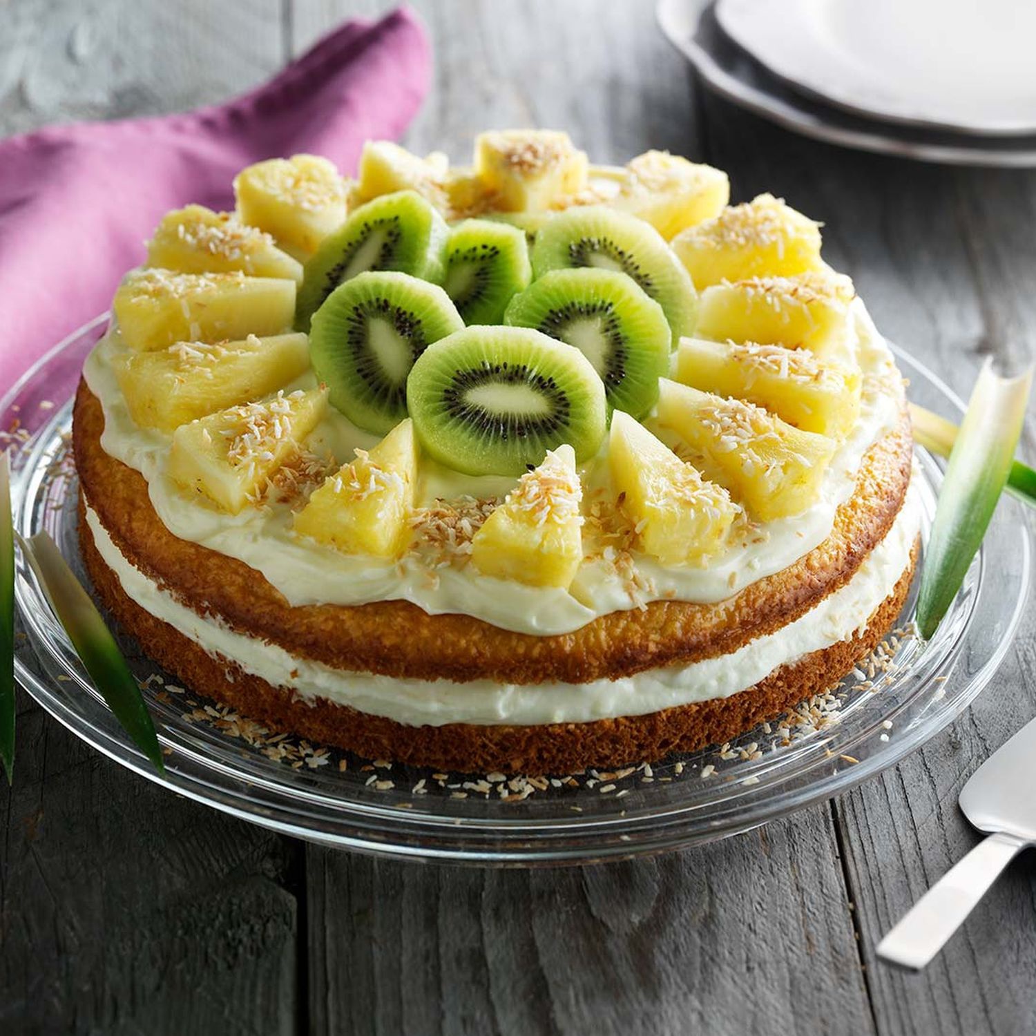 Exotischer Kokoskuchen mit Kiwi und Ananas