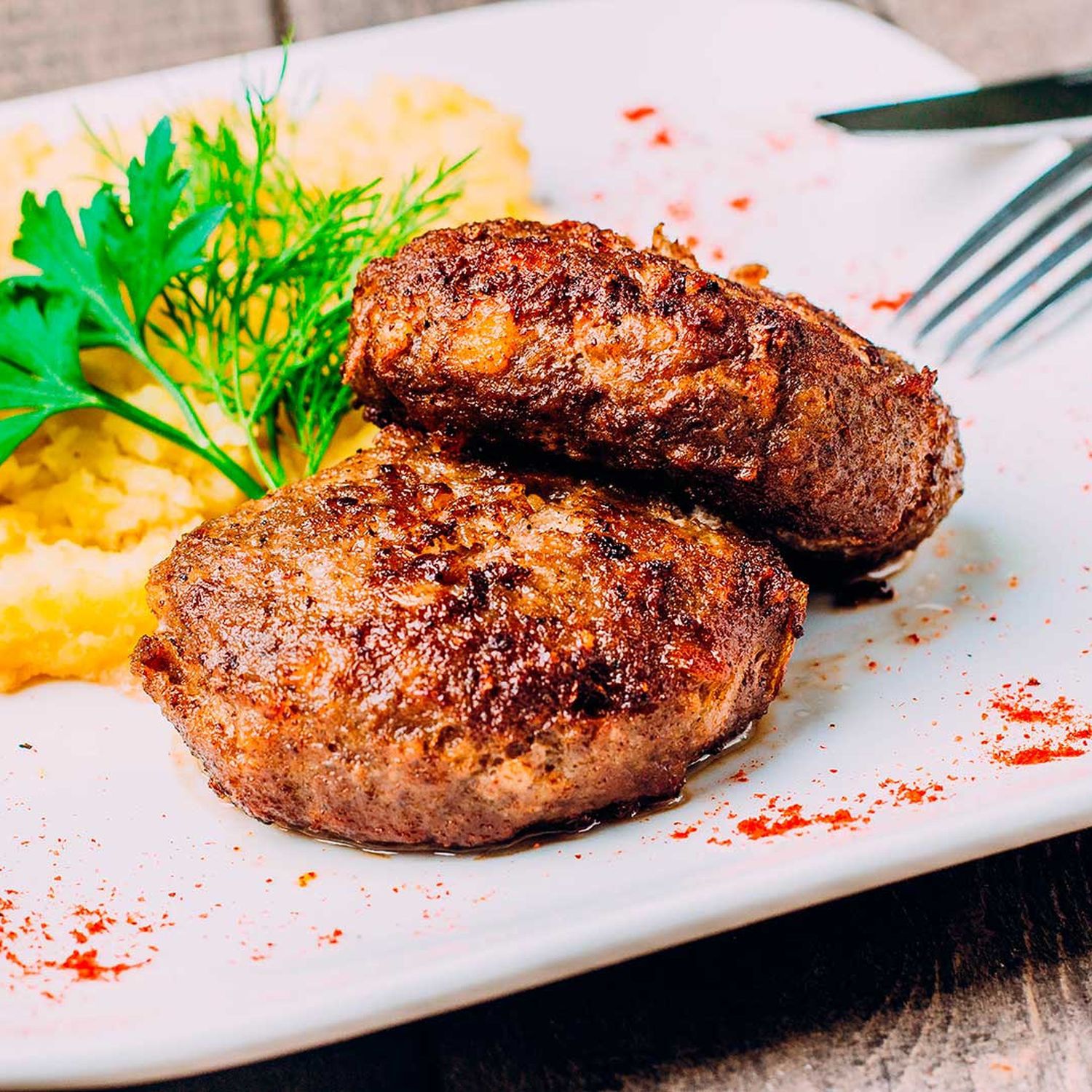 Den faschierten Braten aufschneiden und mit dem Püree anrichten. Mit den restlichen Karottenwürfeln garnieren.