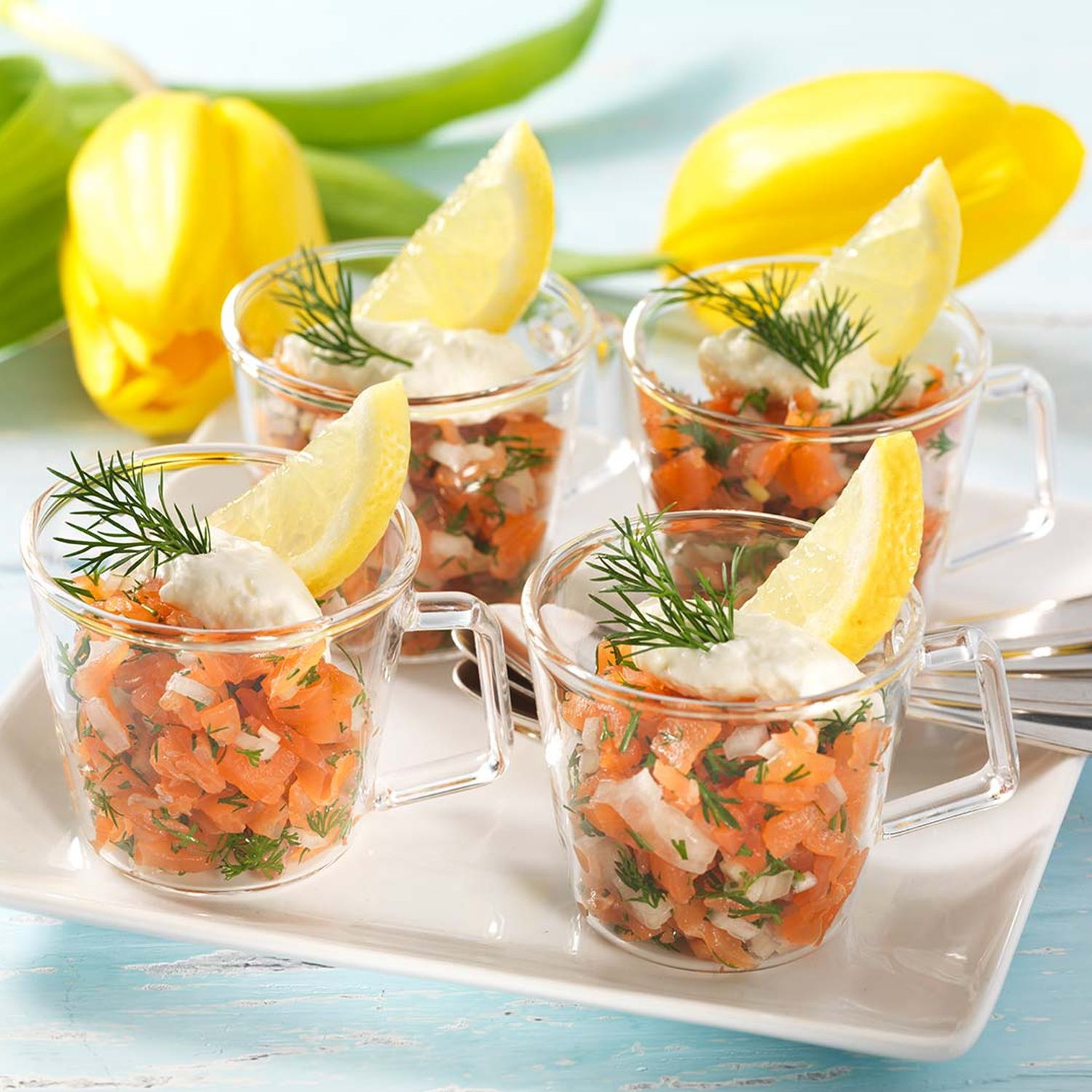 Dekorative Gläser mit dem Räucherlachstatar befüllen und mit dem Kren-Sauerrahm-Dip, dem Dill und den Zitronenspalten verzieren.