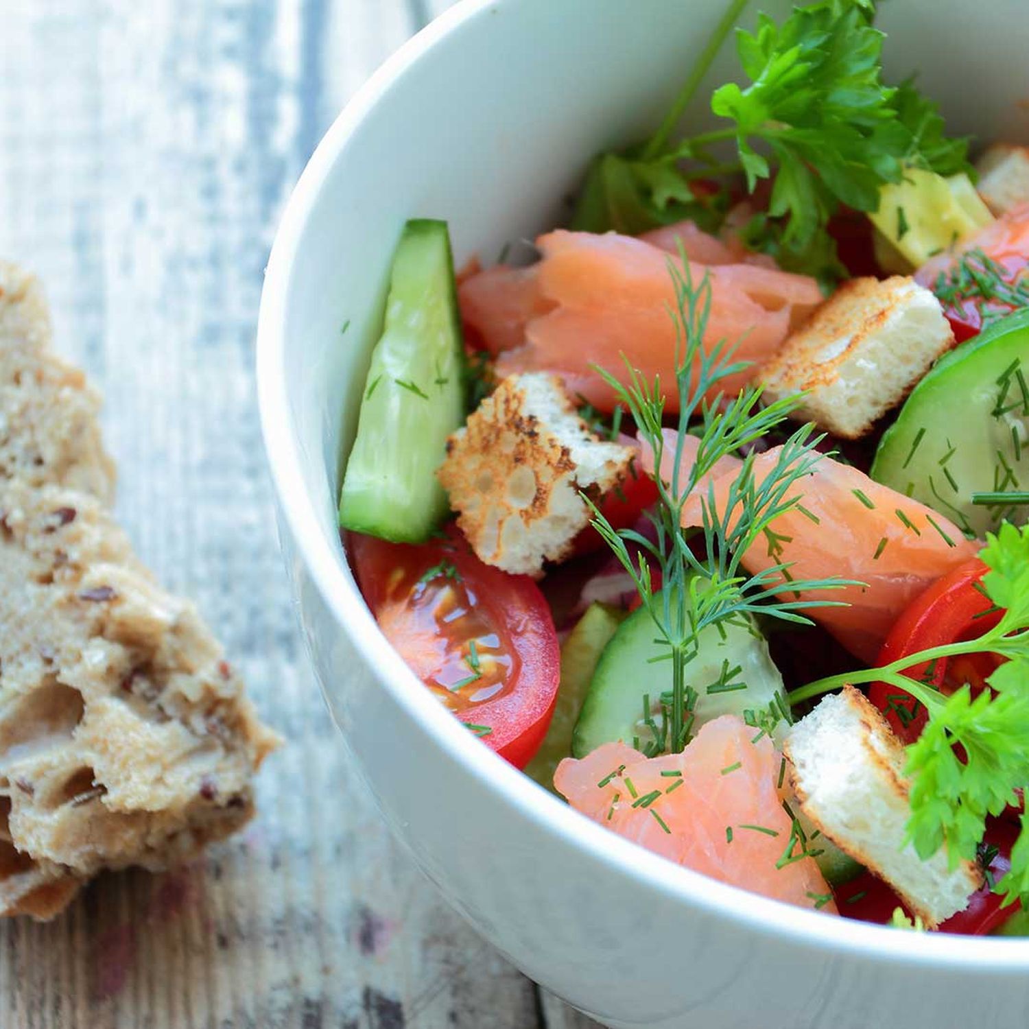 Den Salat auf Teller arrangieren, mit gehacktem Fenchelkraut bestreuen und mit Nussbrotchips und Räucherlachs servieren.