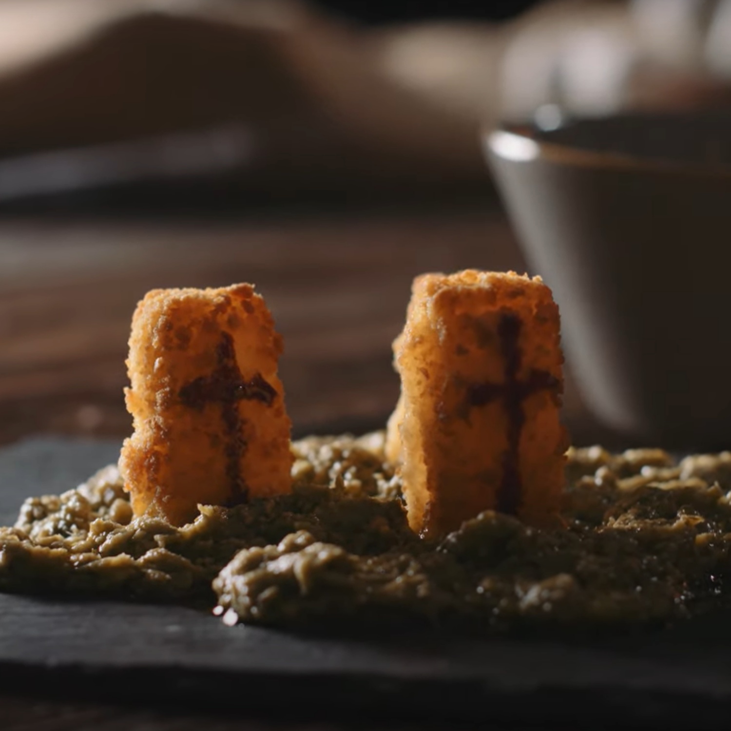 Das Basilikum Pesto auf einer geeigneten Unterlage verteilen, die Fischstäbchen-Grabsteine darauf verteilen und den Gästen servieren.