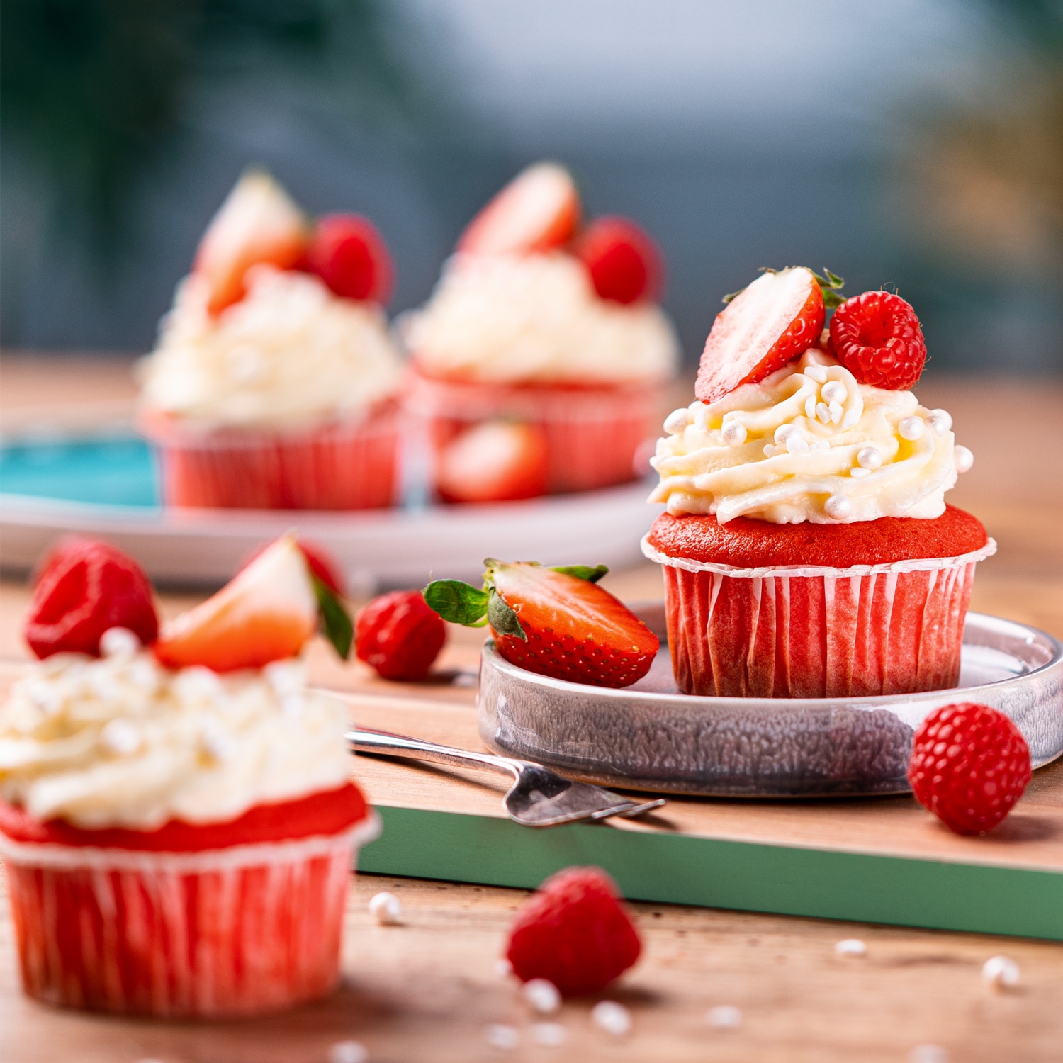 Das Frosting in einen Spritzbeutel mit großer Sterntülle geben und dekorativ auf die ausgekühlten Cupcakes dressieren. Nach Belieben mit Beeren und Zuckerstreuseln garnieren und bis zum Verzehr kaltstellen.
