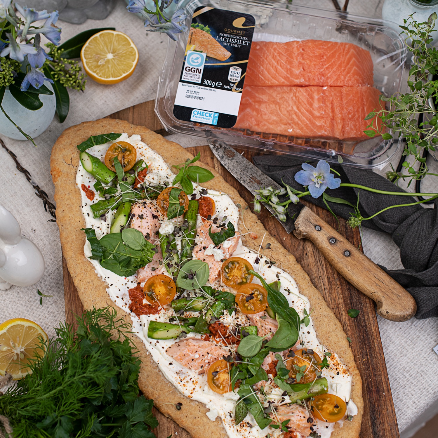Die noch heiße Focaccia mit Sauerrahm bestreichen. Lachs in grobe Stücke teilen und mit dem Spargel auf dem Sauerrahm verteilen. Einige Kleckse rotes Pesto auf der Focaccia verteilen. Mit reichlich frischen Kräutern, Radieschensprossen und Kresse garnieren. Mit Salz & Pfeffer abschmecken.