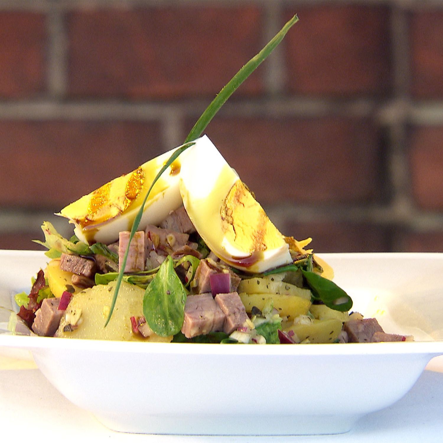 Zu guter Letzt den Salat mit den geviertelten Eiern, Schnittlauch und rohen Spargelspitzen garnieren − fertig ist das frühlingshafte kulinarische Kunstwerk.