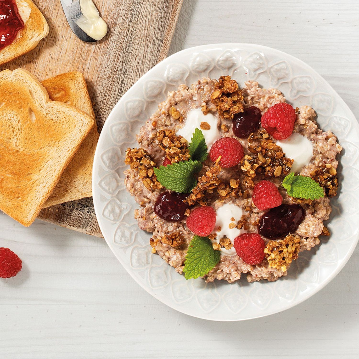 Mit Himbeerkonfitüre vermischen. Auf einem Teller verteilen. Mit dem Crumble, Himbeeren, Minze und Joghurt verzieren.
