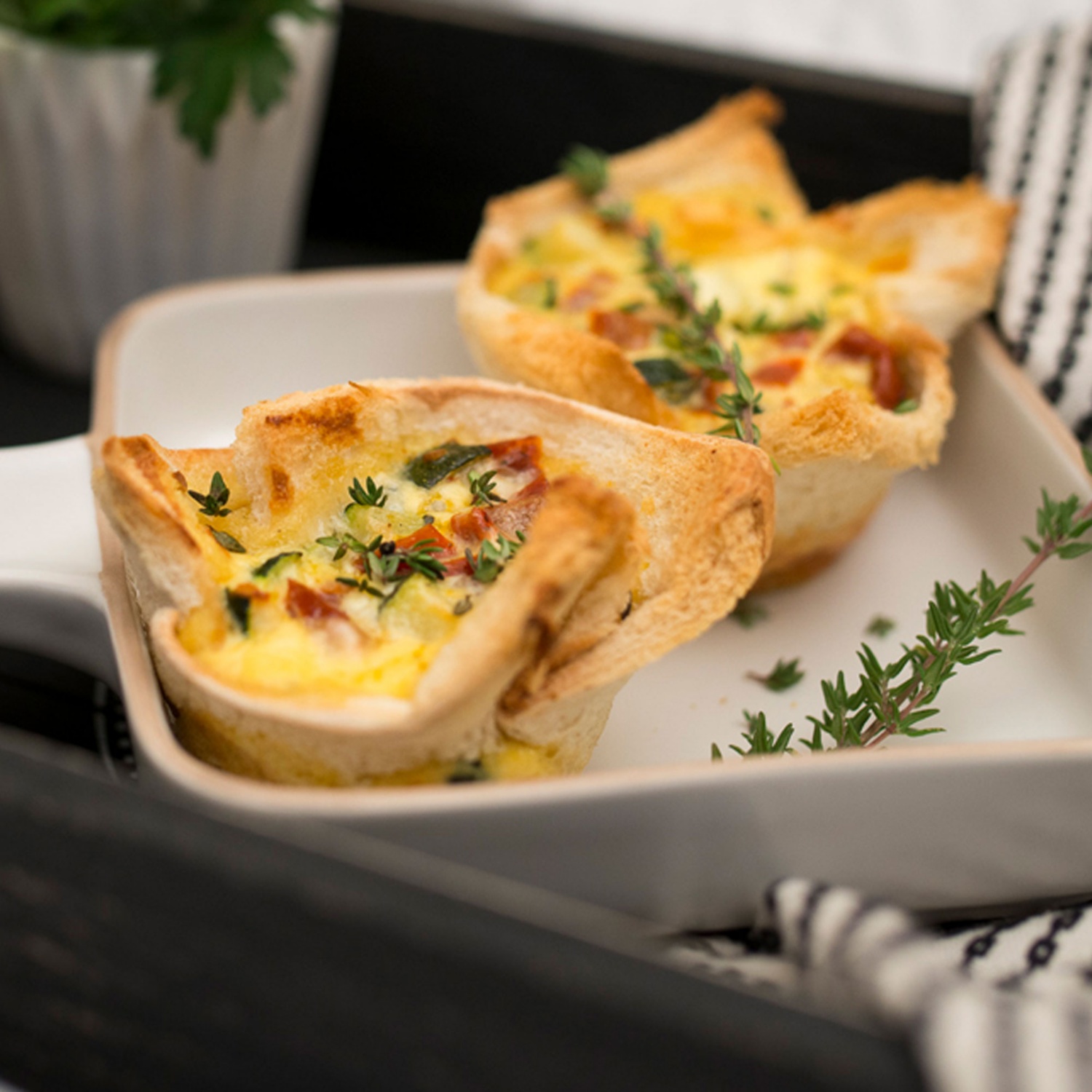 Im Backrohr auf mittlerer Schiene etwa 20 Minuten backen. Nach einigen Minuten Backzeit das Muffinblech mit Alufolie abdecken, da sonst die Toastscheiben zu schnell bräunen.