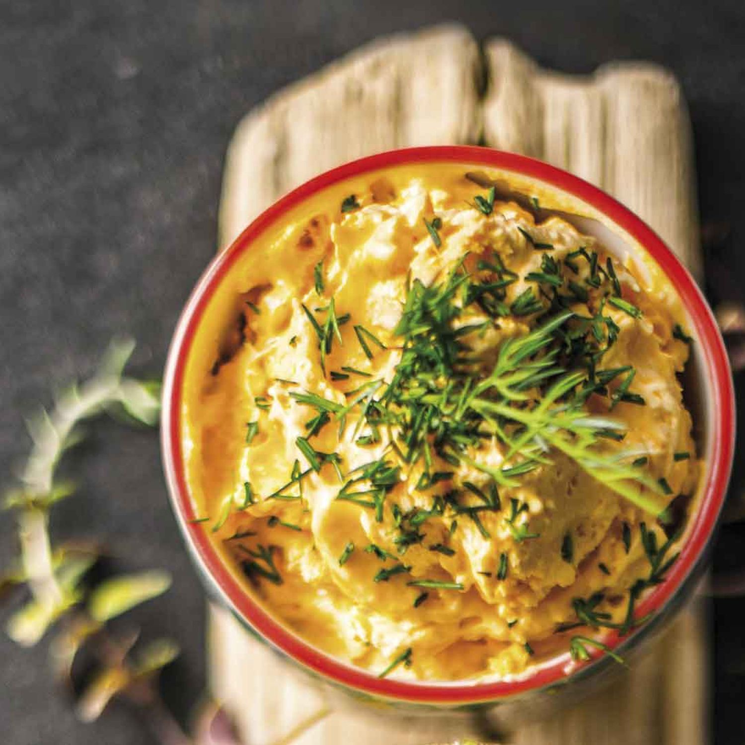 Mit Salz und Pfeffer würzen, abkühlen lassen und mit einen Schneebesen schaumig aufschlagen.