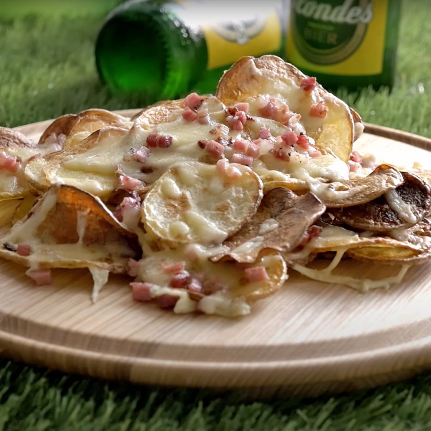 Kleiner Aufwand, große Wirkung: Die selbstgemachten Kartoffel-Chips mit Speck und Käse passen perfekt zum kühlen Blonden beim gemeinsamen Fußball schauen.