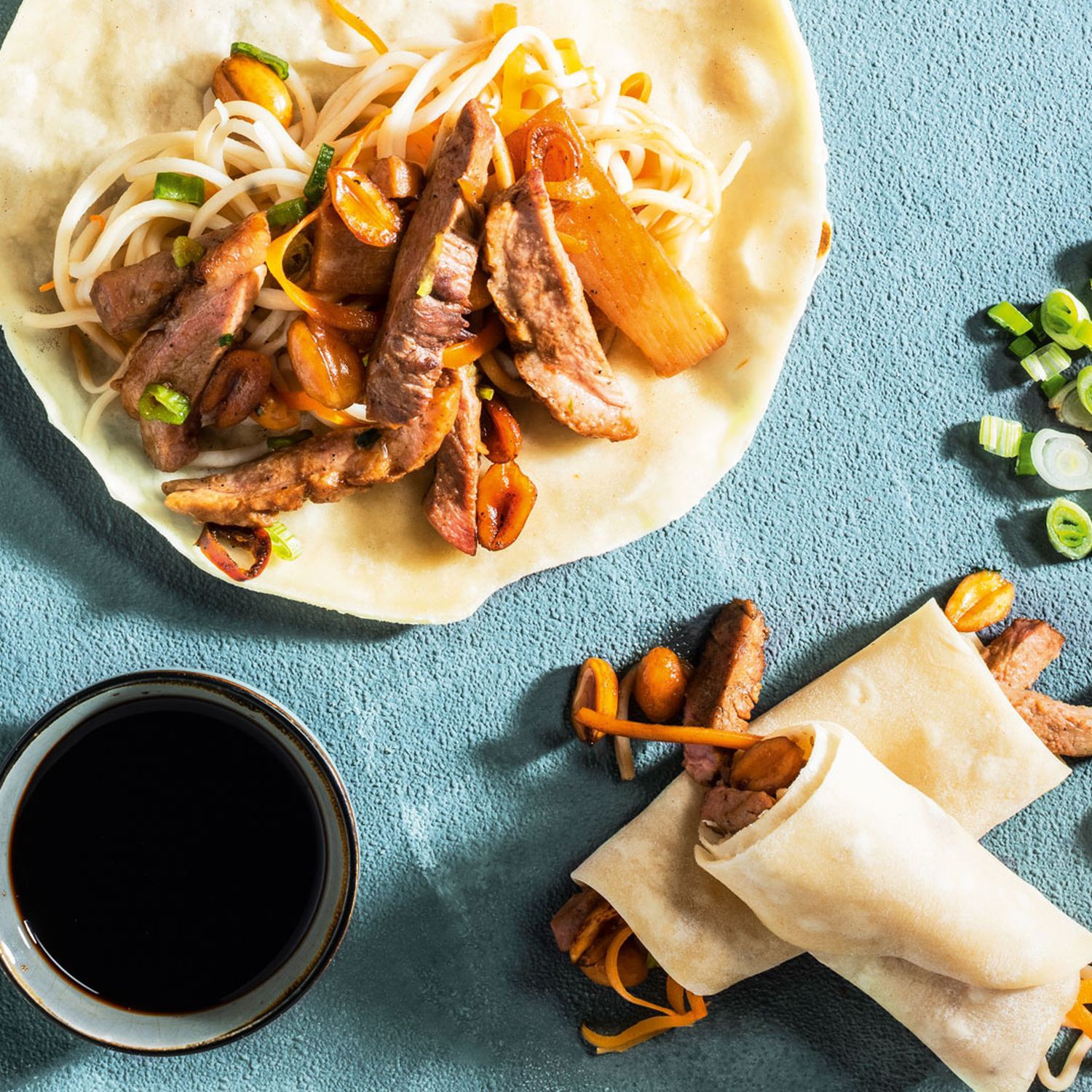 Gebratene Entenbrust in Erdnusssauce mit Mandarin-Pancakes und Karotten-Mie-Nudeln