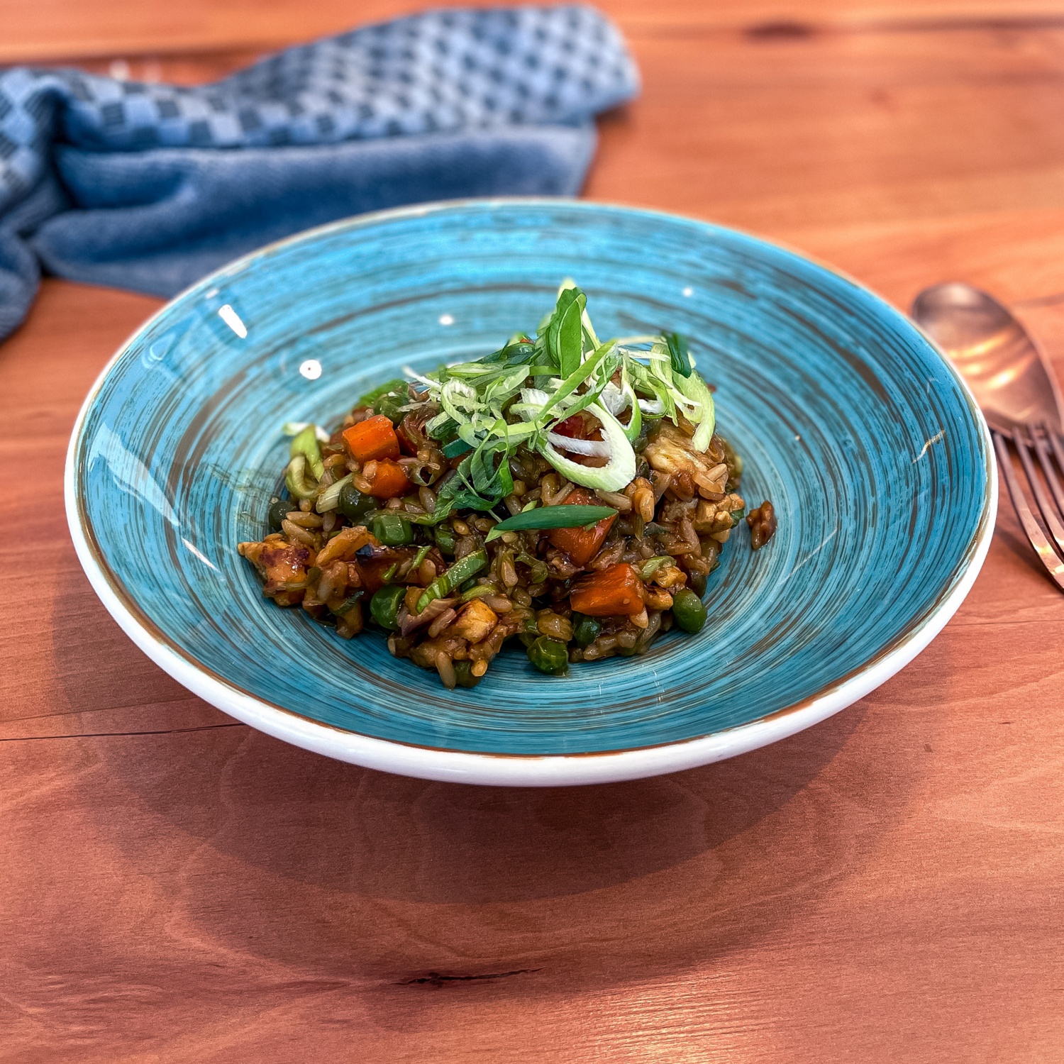 Den vorgekochten Reis, den gebratenen Tofu und die kleingeschnittenen Frühlingszwiebeln untermischen und heiß servieren.